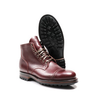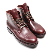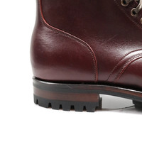 All our Viberg Service Boots are on a single E width, we suggest sizing down one full size from your standard sneaker size or brannock measurement. Consider sizing down a half size if you have a wide foot. Viberg's Service Boot is directly based on their original model, first produced in 1931. A similar pattern was also used by multiple nations as a standard issue military boot during WWII, however Viberg's quintessential Service Boot is modeled after the Canadian military's WWII Service Boot pattern. Wooly CXL is one of Horween's many variations of their world-class Chromexcel leather, which is heavily stuffed with unrefined lanolin, or "wool grease," a natural fat that is collected as a byproduyct of wool production. The lanolin makes this leather more oily, giving it a richer tone and luster. Also, the lanolin is also heat-sensitive at a low enough temperature that it should allow this leather to mold to your foot a bit better than other leathers. We are excited to be one of the only stockists offering this makeup! CXL is a hot-stuffed combination tanned leather that goes through a lengthy tanning process at Horween's facility in Chicago, where it spends a month traveling from floor to floor, becoming heavily impregnated with grease and wax in the process. The end product is a soft, supple, and flexible hide which is packed full of oils, which gives Chromexcel the excellent pullup that it is known for - when the leather is flexed or bent, the oils are displaced and beautiful tonal highs and lows become visible. CXL only gets better with age, and taking care of the leather is as simple as it gets. Frequent brushing will blend scuffs and bring wicked patina, while the inherent oils in the hide keep it from drying out quickly. - Horween Burgundy Wooly Chromexcel (CXL) - 2030 last - Unlined Upper - Tan Kip Lined Vamp - Gusseted CXL tongue - 8 AA carmel eyelets - Leather structured toe - Brogue toe cap - Antique Leather Midsole - Black Commando Outsoles and Heels - Traditional Resolable Stitch Down Construction - Small batch, limited run production made at Viberg's factory in Victoria, BC
