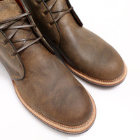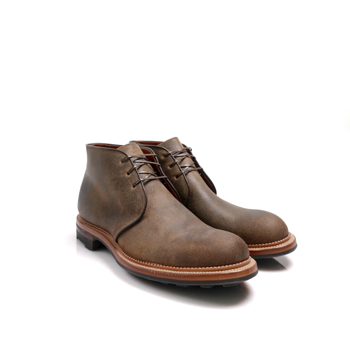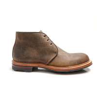 All our Viberg Service Boots are on a single E width, we suggest sizing down one full size from your standard sneaker size or brannock measurement. Consider sizing down a half size if you have a wide foot. Viberg's Uplands Boot is their take on the 3-eye chukka boot, a classic everyday style that offers both elegance and versatility, for whatever social situation or event you find yourself in. C.F. Stead's Waxy Commander offers an elite combination of patina-potential and weather resistance, thanks to a suede upper that has been heavily waxed for waterproofing - with the added benefit of improving the depth of texture in the suede. Waxy Commander uses Stead's proprietary tannage, which shrinks and increases the density of the fibers, serving to waterproof the uppers in combination with the wax, while also keeping the leather looking natural after the heavy waxing. With such a rich history, Stead have long developed rich, unique leather dyes that, in cooperation with the wax, produce incredible colours that are sure to patina outstandingly well. - C.F. Stead Antique Waxy Commander - 1940 last - Unlined upper - Tan Kip lined vamp - Leather toe puff toe structure - Ridgeway outsoles and heels - Natural leather midsole - Resoleable 360 scallop welt construction - Made in Victoria, British Columbia