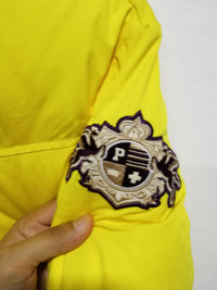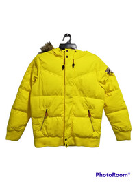 RARE Nike Yellow Puffer With Fur Size on tag : M Brand : Nike Armpit to armpit : 22" Top to bottom : 25" Material : Cotton /Nylon Colour : Yellow Condition : GOOD CONDITION, need to wash. Minor stain, can clean after wash
