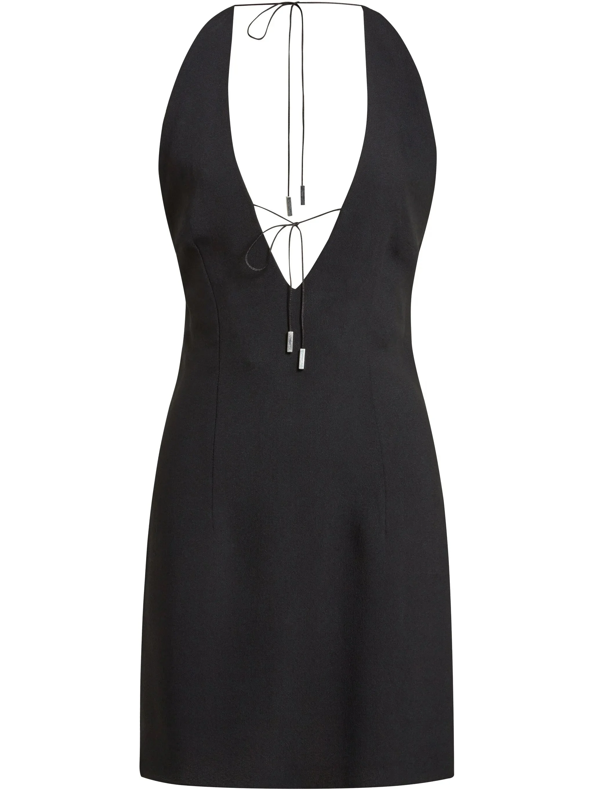 - black - crepe texture - rear tie fastening - spaghetti straps - plunging V-neck - sleeveless - draped detailing - open back - fitted waistline - straight hem - thigh-length Materials & Product Care Lining: Recycled Polyester 100% Outer: Polyester 100%