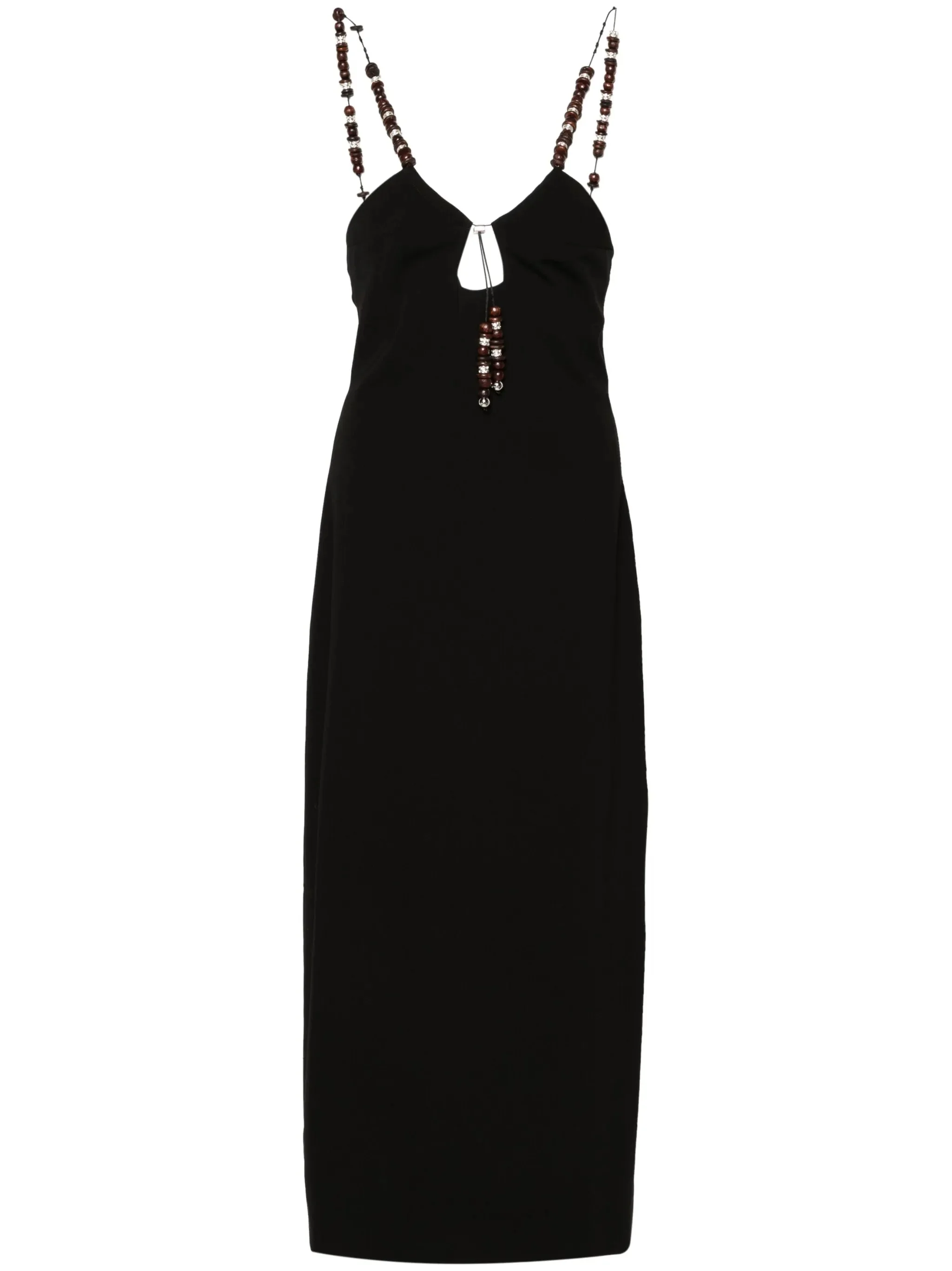 - black - jersey texture - bead detailing - rhinestone embellishment - cut-out detailing - dart detailing - V-neck - sleeveless - concealed rear zip fastening - rear slit - straight hem - mid-length - full lining Materials & Product Care Leather 100% Lining: Polyester 100% Outer: Polyester 100% Size & Fit - Designed for a slim fit that sits just away from the body offering a close yet comfortable fit - Made from a midweight non-stretch fabric - This piece fits true to size – take your usual size - The model is 1.77 m wearing size 8.