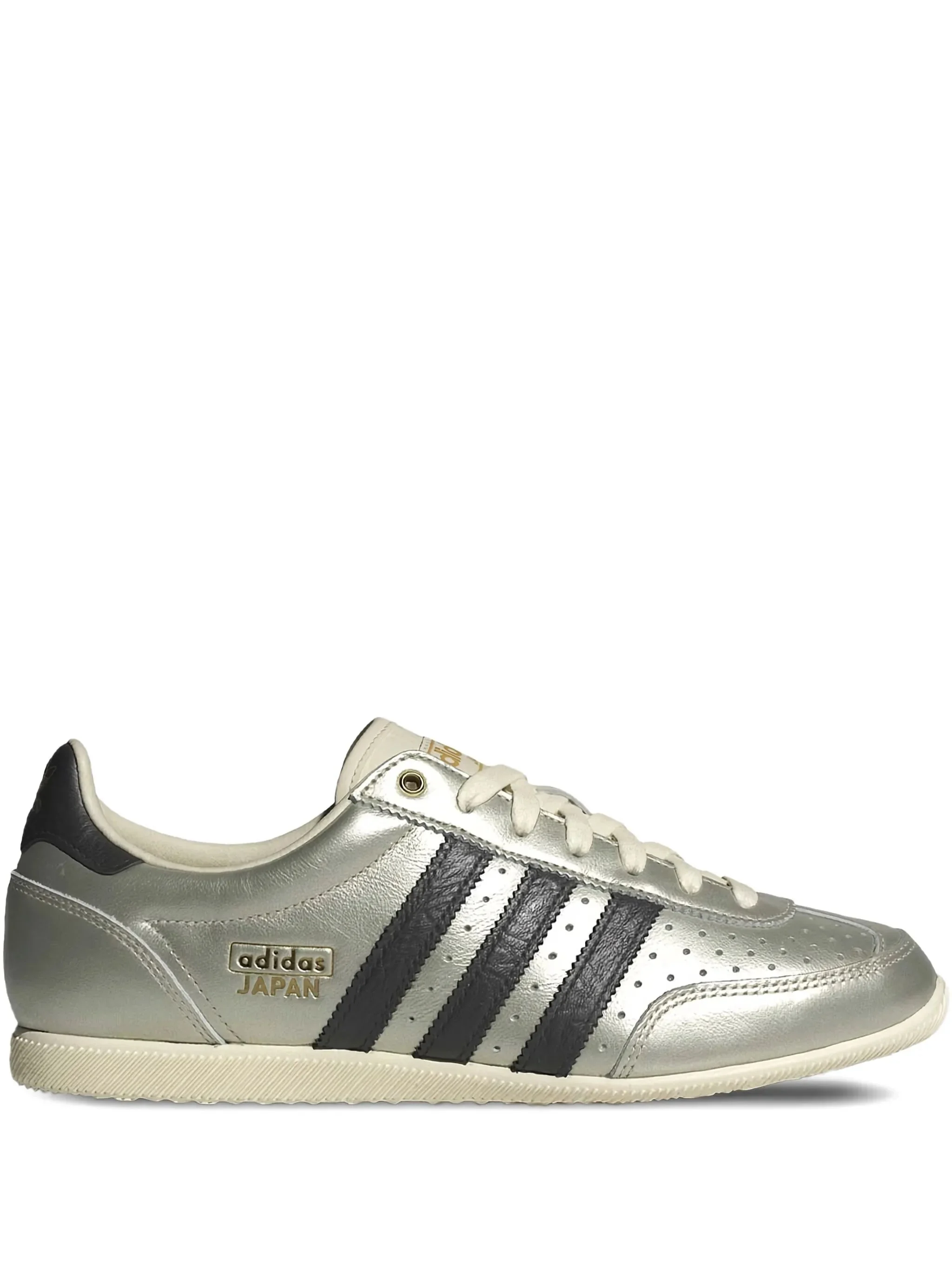 - silver - leather upper - three black stripes - perforated detailing - cream sole - round toe Materials & Product Care Lining: Fabric 100% Outer: Metallic Leather 100% Sole: Virgin Rubber 100%