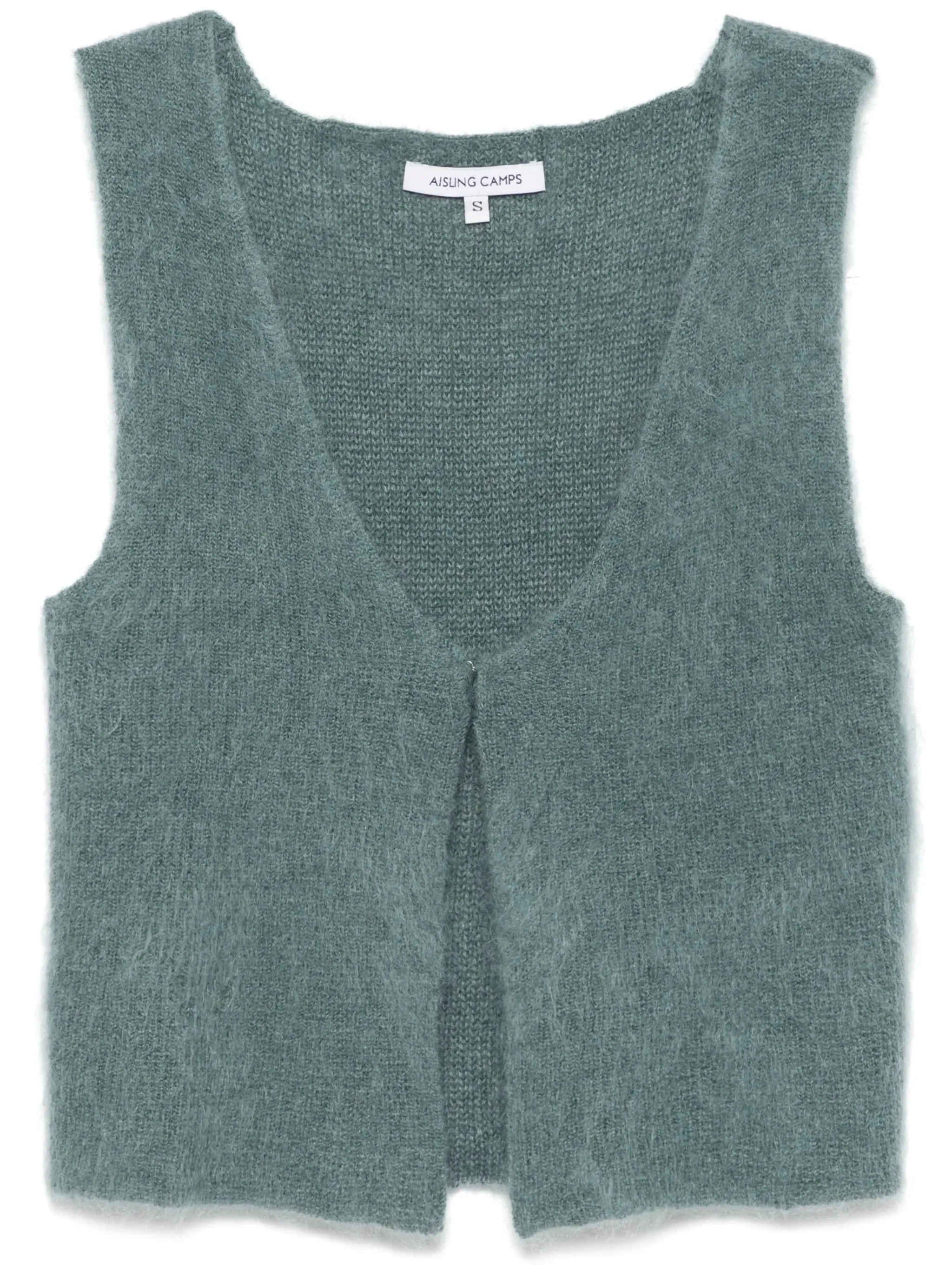 - teal blue - front hook and eye fastening - front slit - V-neck - sleeveless Materials & Product Care Kid Mohair 44%, Polyamide 34%, Wool 22% Size & Fit - Designed for a slim fit that sits just away from the body offering a close yet comfortable fit - Made with a midweight knit, this piece offers some stretch - The model is 1.78 m wearing size S.