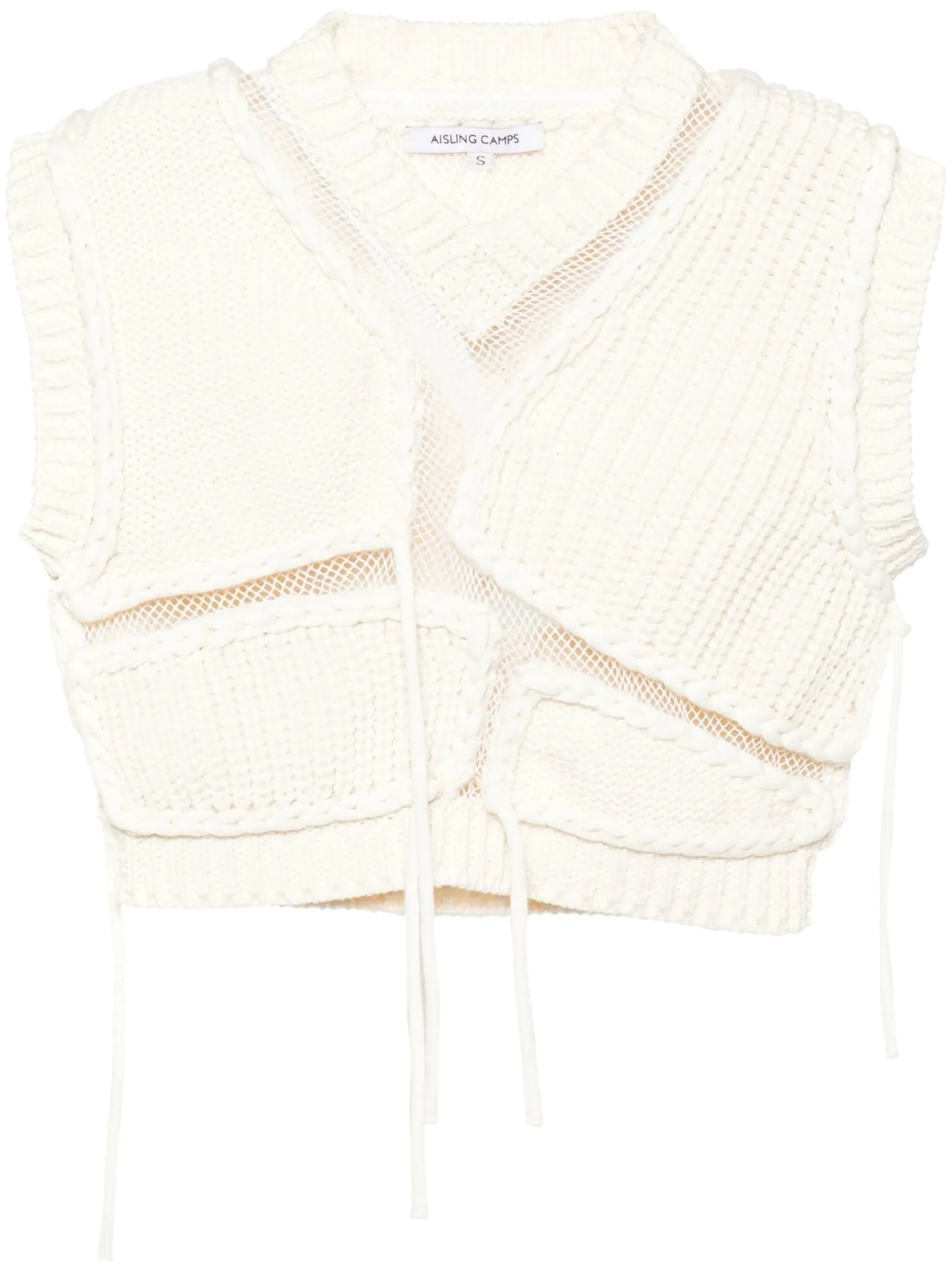 - ivory white - cotton blend - knitted construction - fisherman's knit - mesh panelling - ribbed V-neck - braid detailing - sleeveless - ribbed hem Materials & Product Care Cotton 76%, Nylon 24% Size & Fit - Designed for a slim fit that sits just away from the body offering a close yet comfortable fit - Made with a midweight knit, this piece offers some stretch - This piece fits true to size – take your usual size - The model is 1.78 m wearing size S.