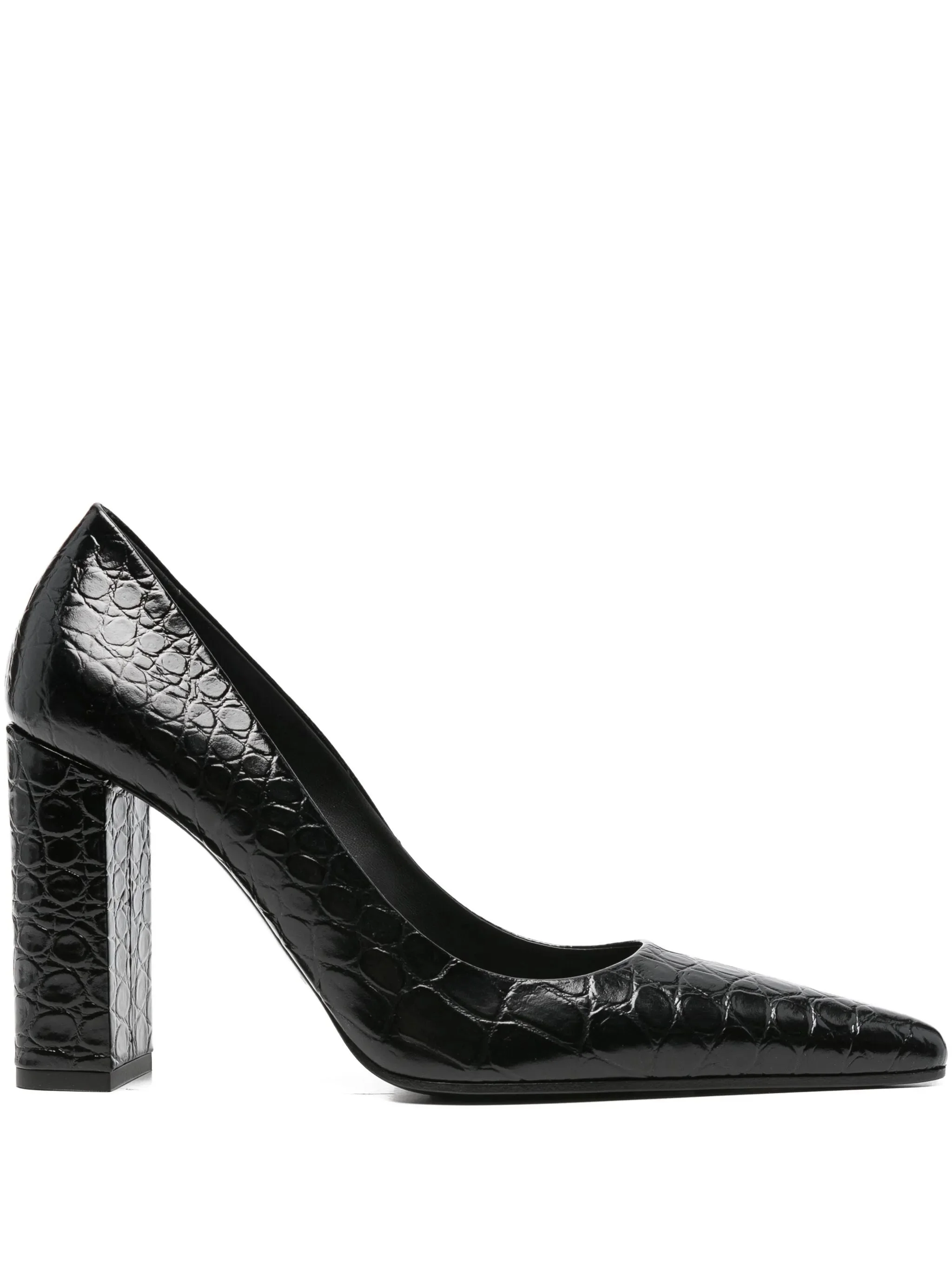- black - crocodile embossed - pointed toe - block heel - leather upper Materials & Product Care Lining: Calfskin 5%, Goat Skin 5%, Lambskin 90% Outer: Calfskin 100% Sole: Calfskin 80%, Rubber 20%