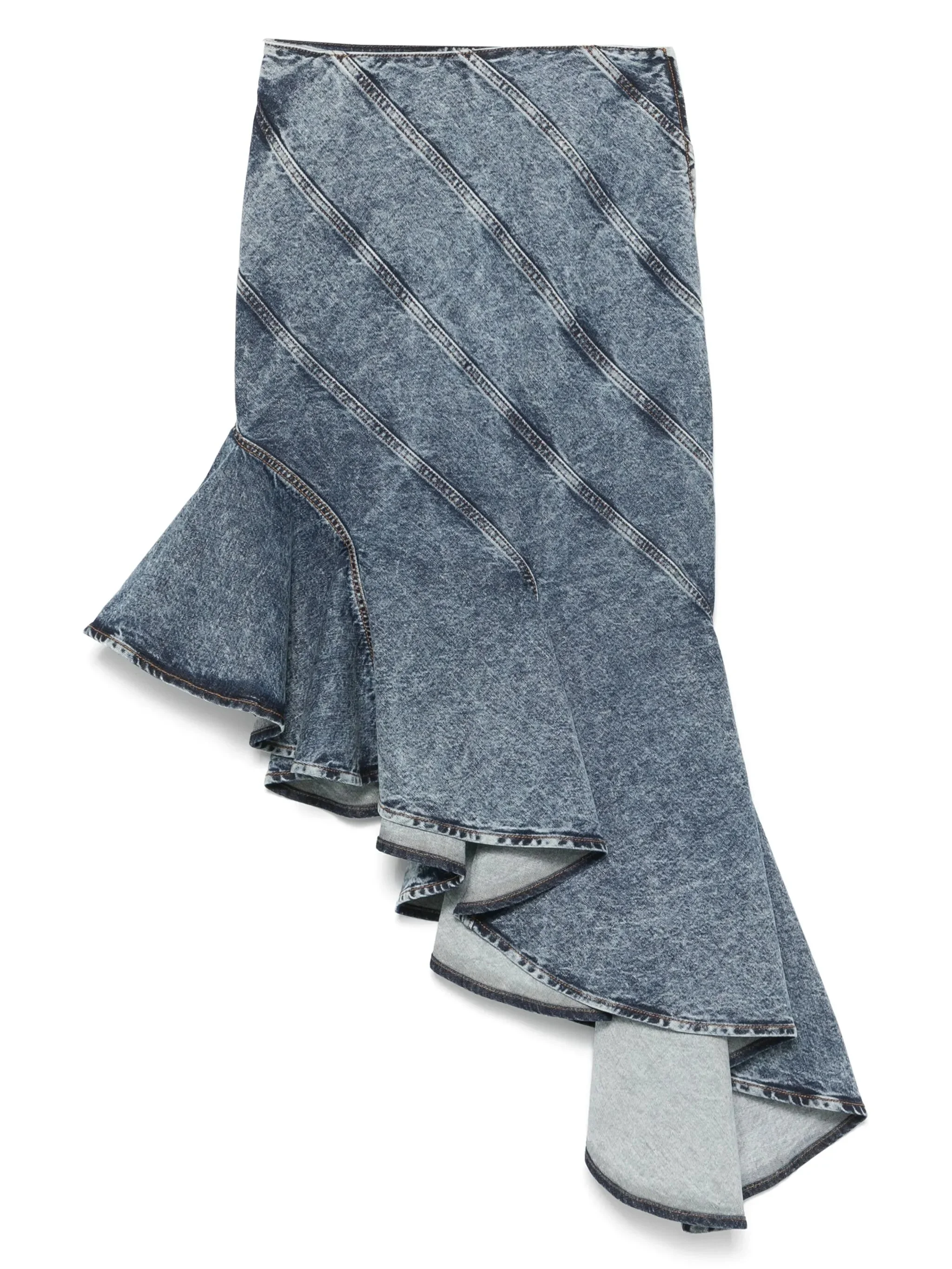 - indigo blue - side zip fastening - ruffled detailing - asymmetric hem Materials & Product Care Natural (Veg) > Cotton 99% Synthetic > Polyurethane 1% Size & Fit - Constructed from stretch denim, this piece offers a stretch fit with durability - Designed with an asymmetric hem, this skirt is intended to be worn low on the hips - The model is 1.75 m wearing size 36.