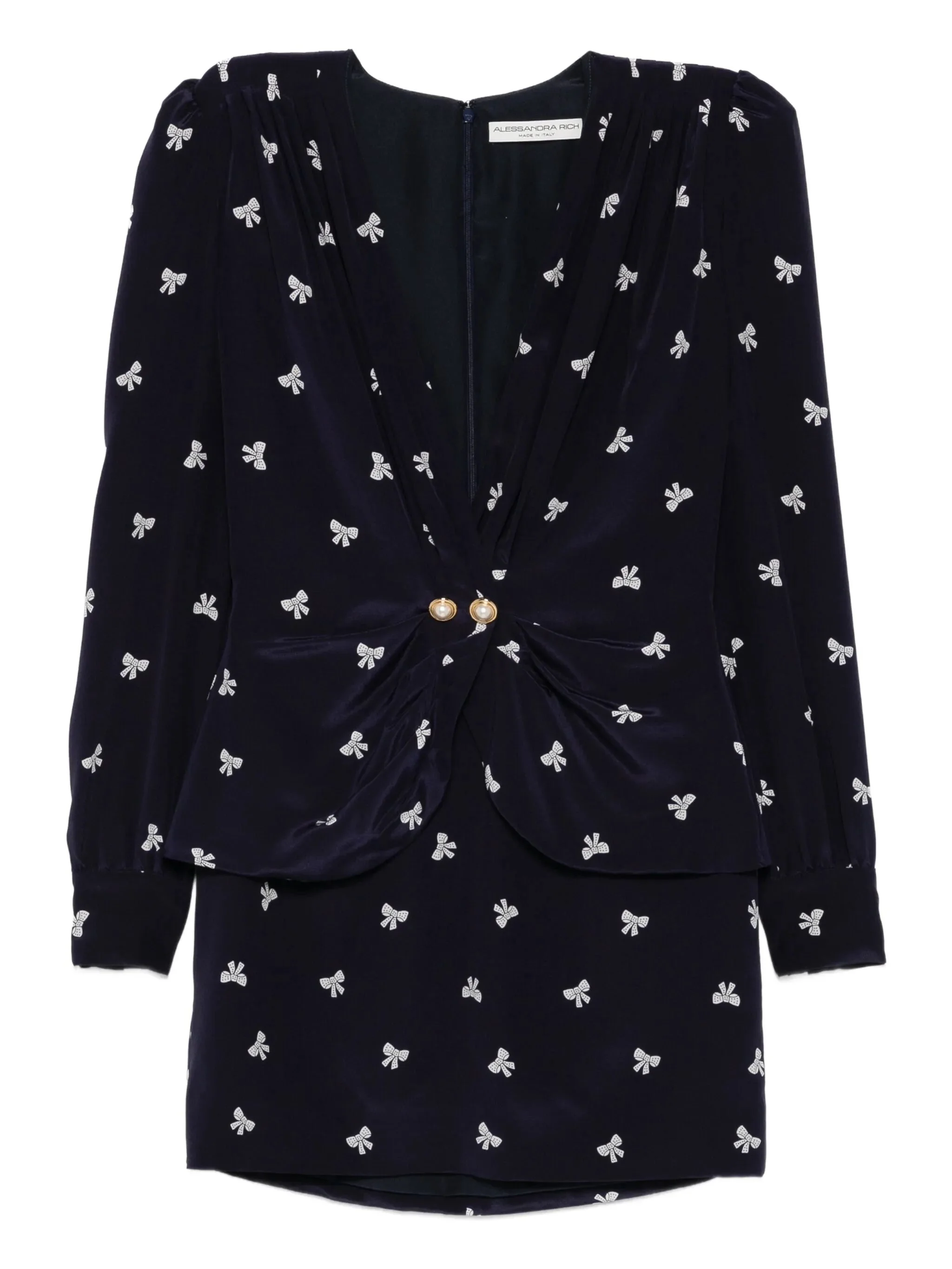 Wrap-effect embellished pleated printed silk crepe de chine mini dress Navy