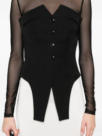 - black - front button fastening - adjustable strap to the rear - boned bodice - dart detailing Materials & Product Care Lining: viscose 100% Outer: Wool 100% Size & Fit - Designed for a close fit throughout - Made from a midweight non-stretch fabric - The model is 1.78 m wearing size 6.