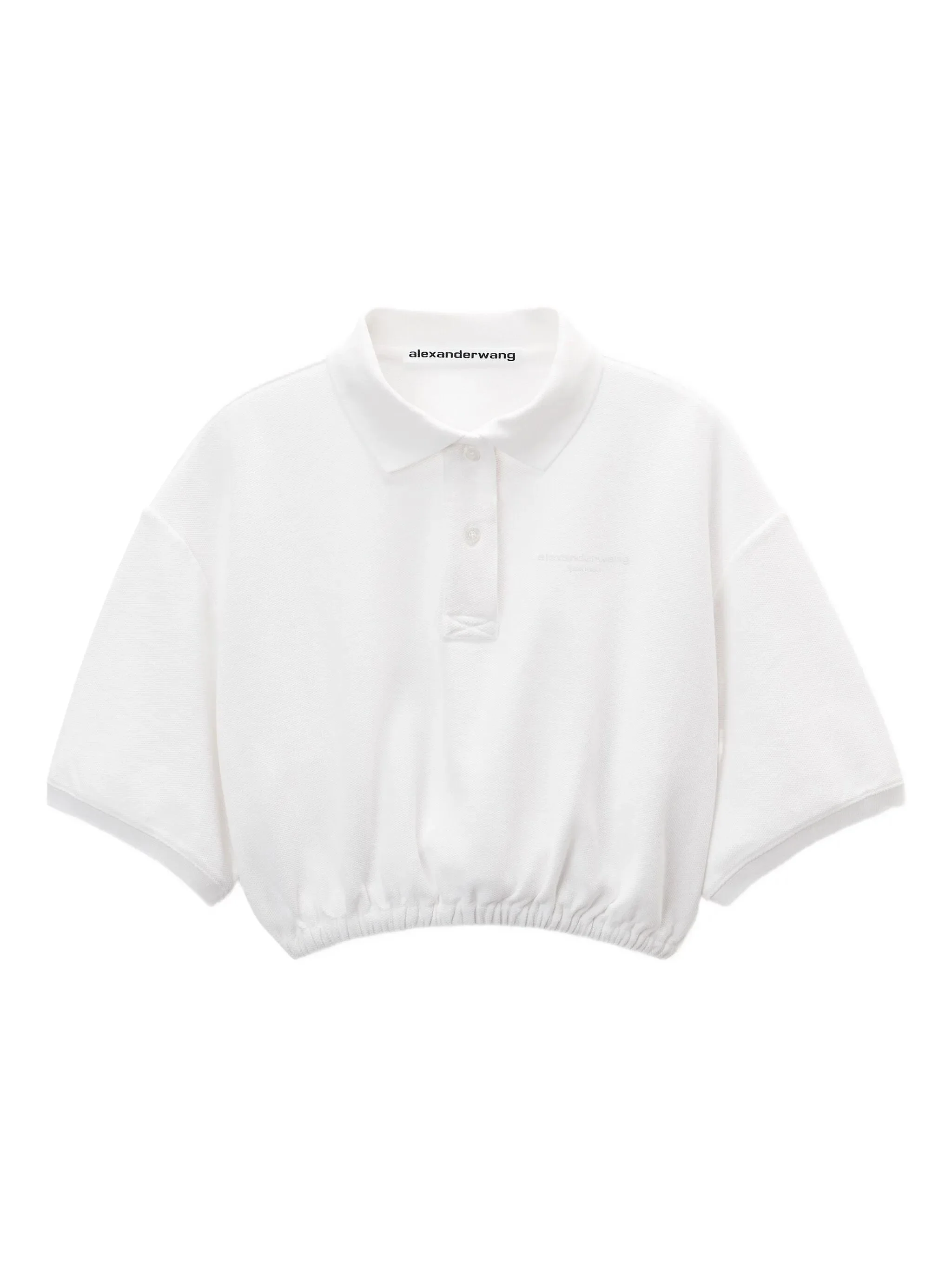- off-white - polo collar - short sleeves - elasticated hem - cropped length Materials & Product Care Cotton 98%, Elastane 2%