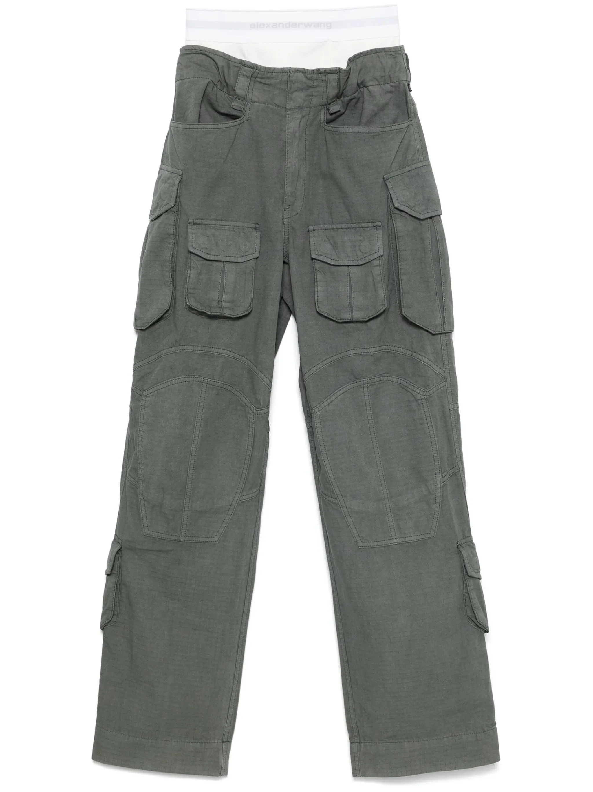 - olive green - front press-stud and zip fastening - belt loops - multiple cargo pockets - two rear zip-fastening pockets Materials & Product Care Cotton 89%, Elastane 11%, Lyocell 11%, Polyamide 69%, Polyester 20% Size & Fit - Designed with a wide-leg cut, these trousers allow for a close fit at the waist and offer a loose and roomy fit over the leg - Made from a midweight non-stretch fabric - The elasticated waist allows for a comfortable fit - The model is 1.78 m wearing size 27.