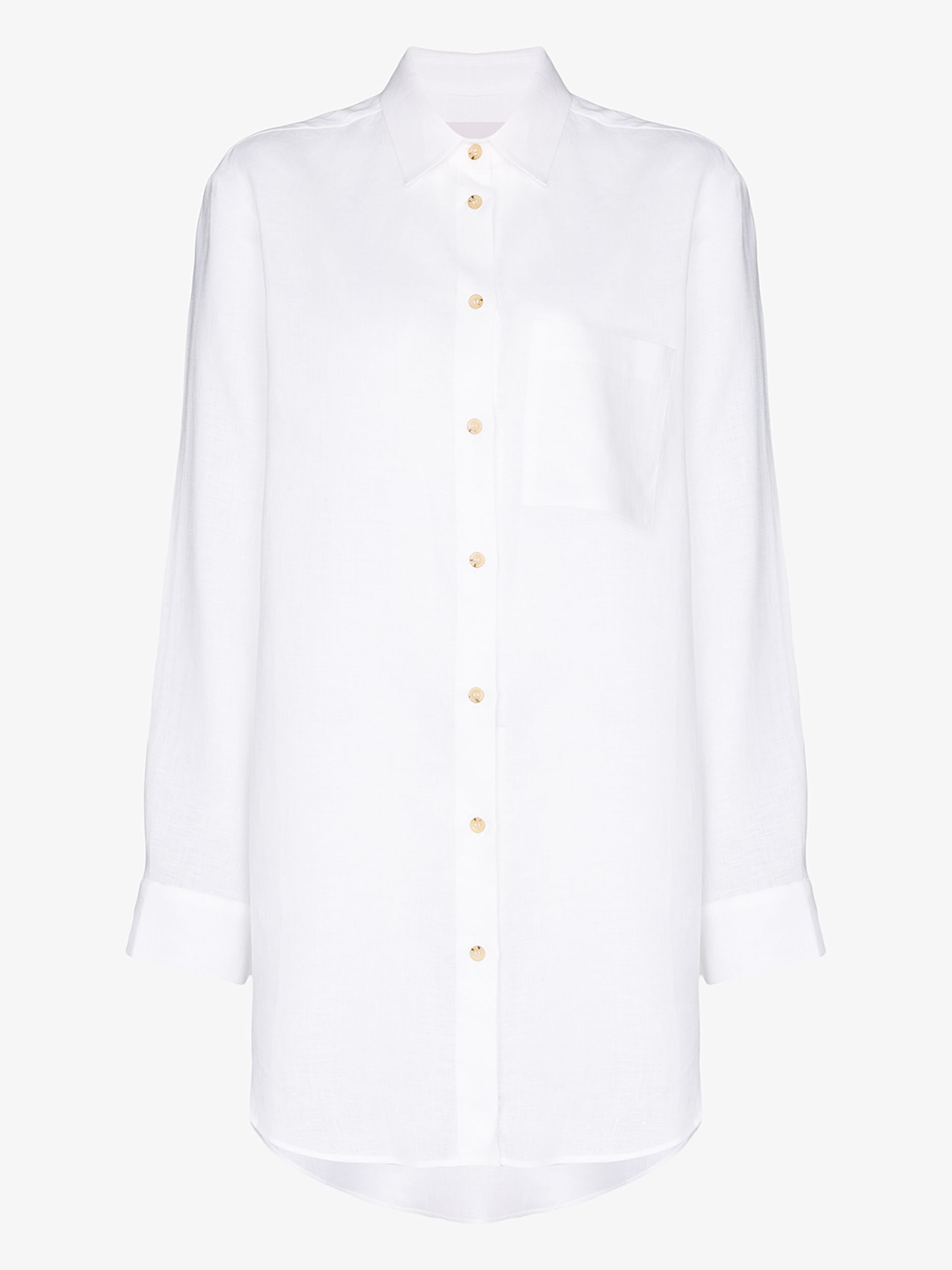 - This white Asceno Formentera oversized linen shirt features a point collar, long sleeves, buttoned cuffs, a chest patch pocket, back box pleat, long curved hem and button fastenings. A white shirt is one of life’s essentials, along with food, water, shelter and a walk-in wardrobe (for all your white shirts, course). This Asceno one is just the thing to expand your collection. Size & Fit - This piece fits true to size. We recommend you select your regular size - Cut for a relaxed fit - Made with a mid-weight non-stretch fabric - The model is 175 cm/ 5’7" wears a size S Materials & Product Care Composition: Linen/Flax 100%