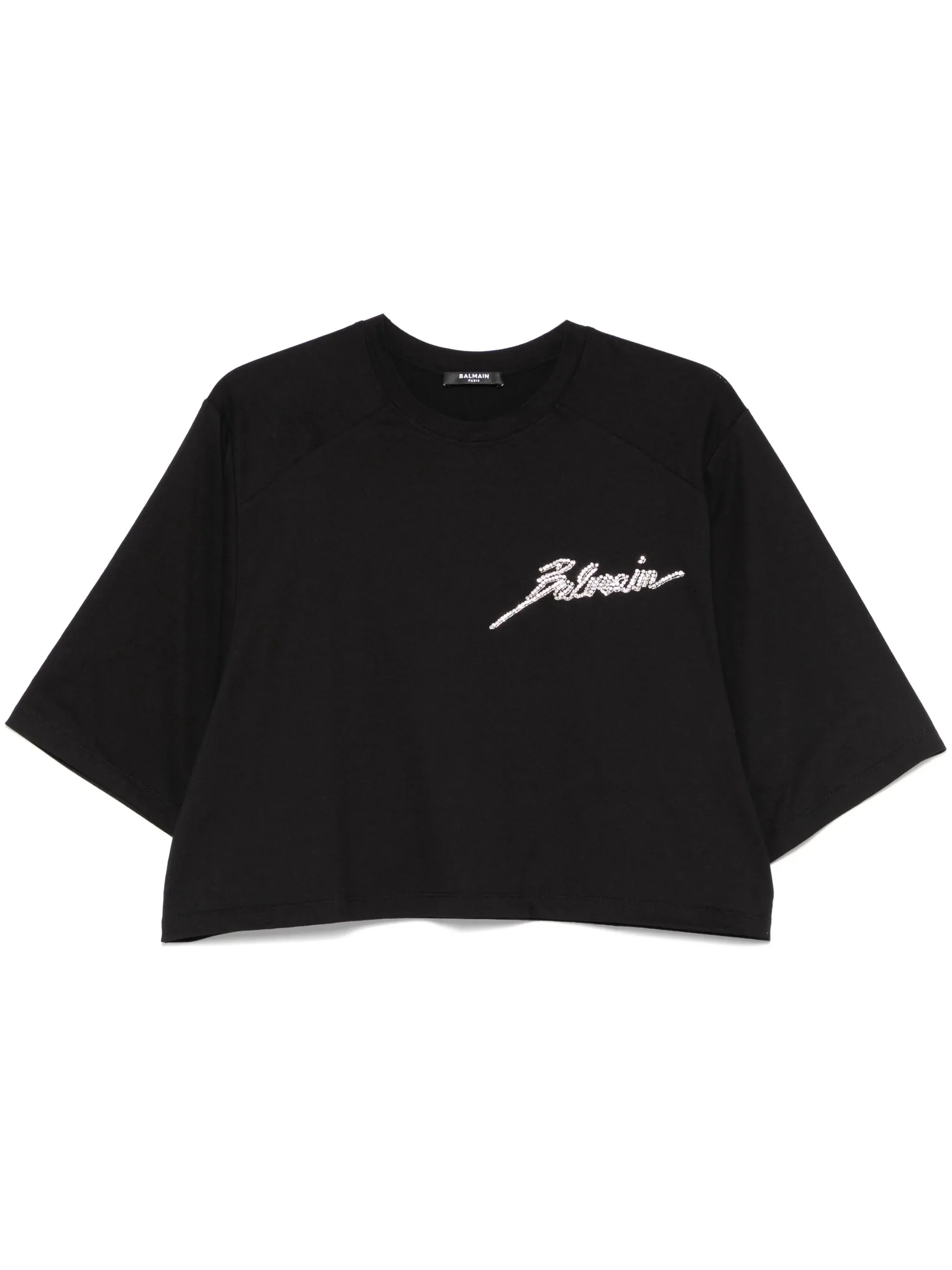 - black - crew neck - short sleeves - cropped Materials & Product Care Brass 20%, Cotton 100%, glass 80% Size & Fit - Cropped in length - Designed for an oversized fit, offering additional room throughout - Made from a midweight non-stretch fabric, this piece offers minimal elasticity when worn - The model is 1.77 m wearing size S.