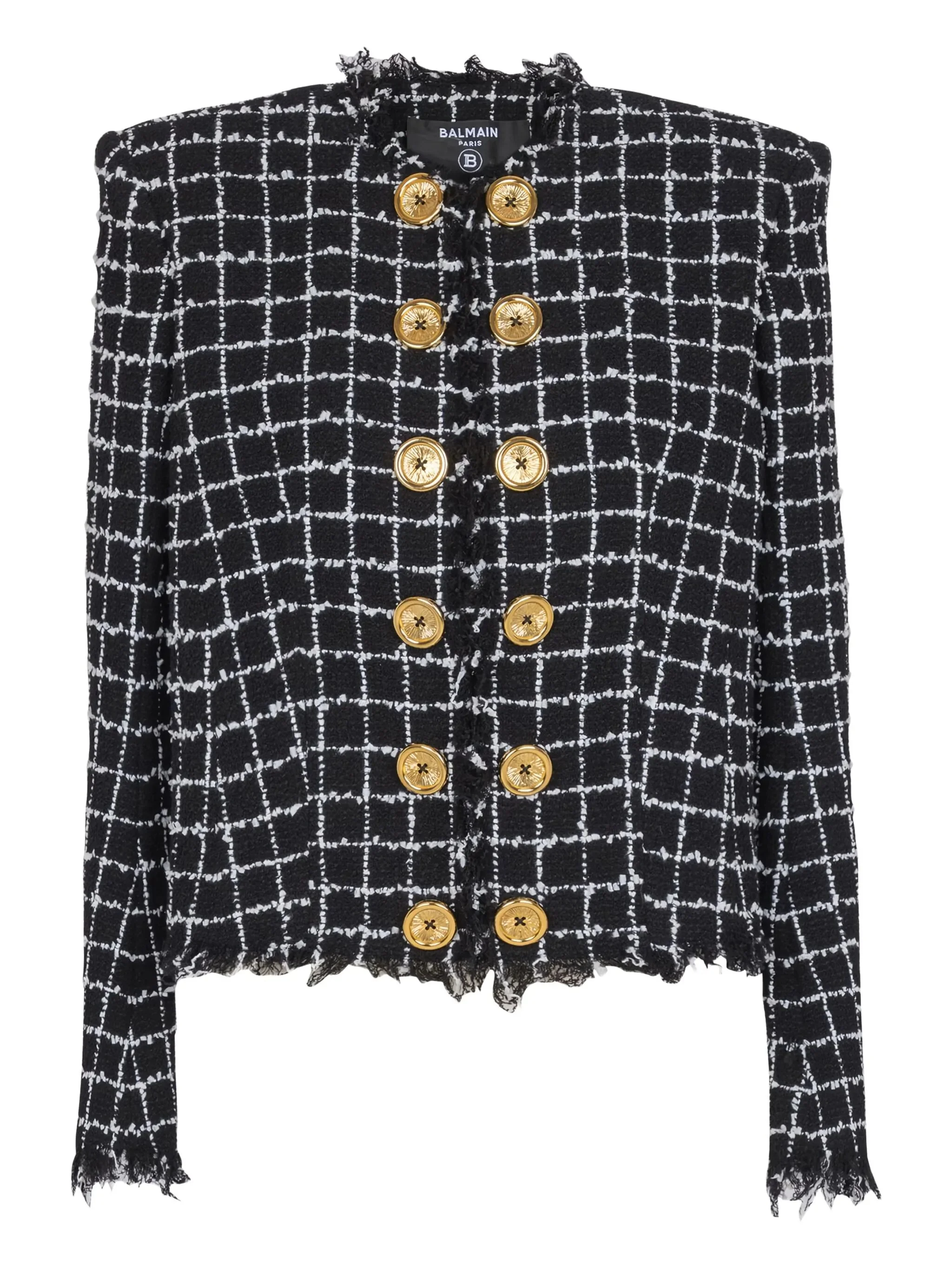 - black - tweed texture - frayed edges - gold-tone buttons - grid pattern - long sleeves Materials & Product Care Cotton 29%, Modacrylic 9%, Polyamide 62%