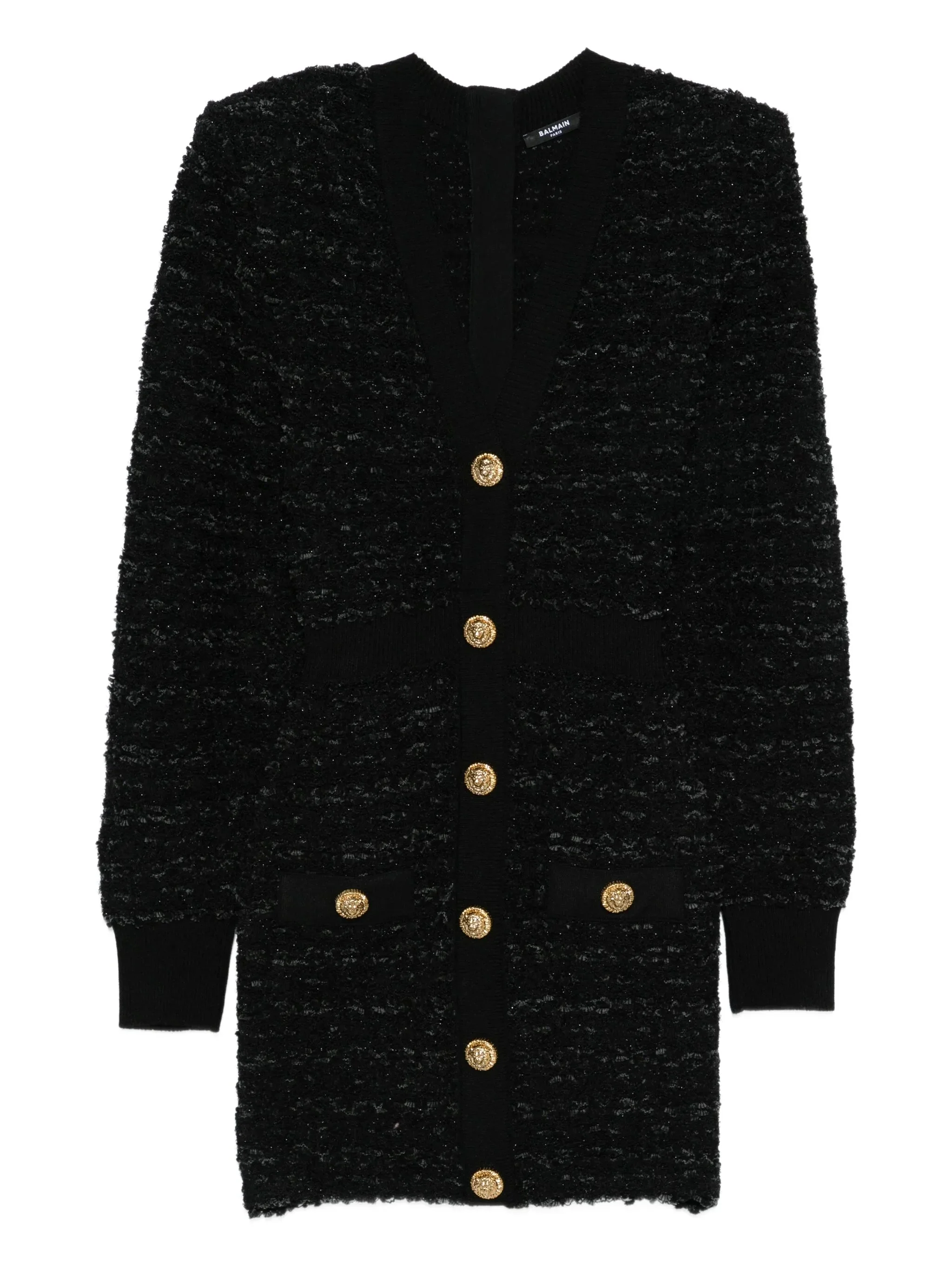 - black - tweed knit - gold-tone buttons - two pockets - V-neck - ribbed cuffs Materials & Product Care Fabric 100% Size & Fit - The model is 1.79 m wearing size 36.