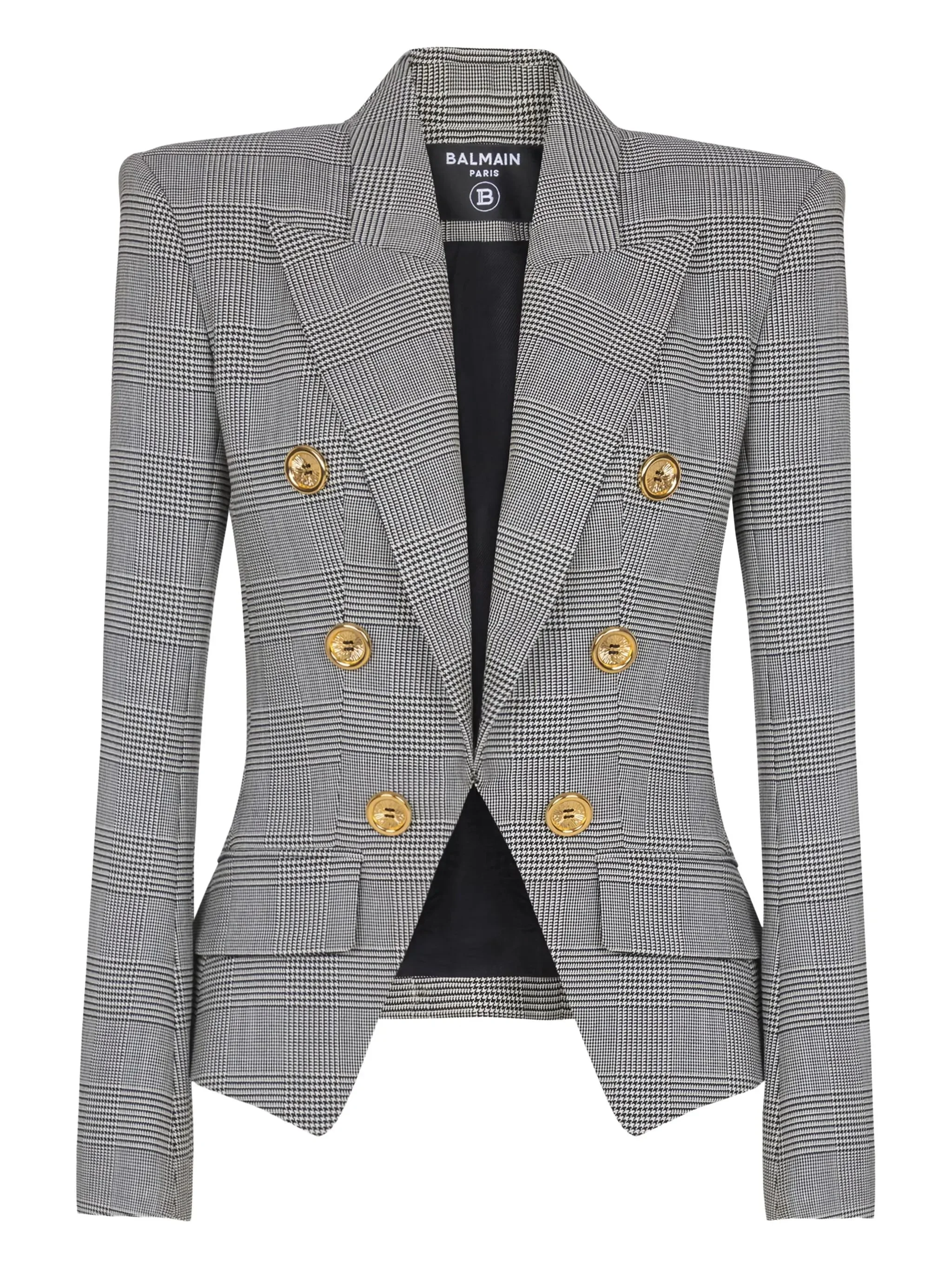 - black - Prince of Wales pattern - six-button fastening - gold-tone buttons - double-breasted - wool composition Materials & Product Care Polyamide 4%, Spandex/Elastane 1%, Virgin Wool 95%