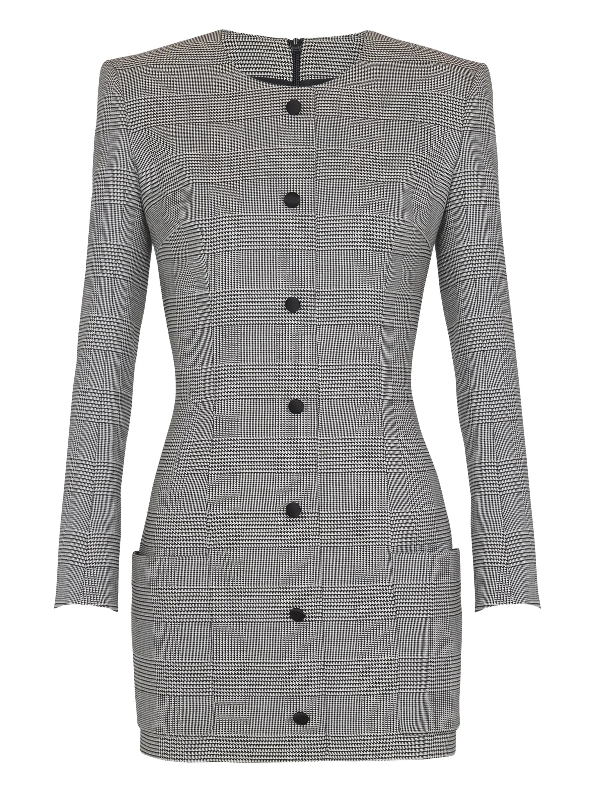 - grey/black - Prince of Wales check - button detailing - rear zip fastening - long sleeves - front patch pockets - round neck Materials & Product Care Polyamide 5%, Spandex/Elastane 1%, Virgin Wool 95%, Wool 95%
