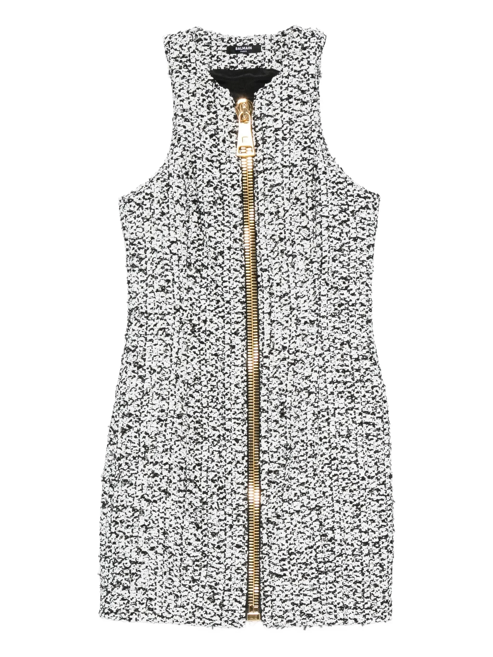 - white and black - tweed texture - halterneck - zip front fastening - sleeveless - short length Materials & Product Care Polyamide 93%, viscose 7%