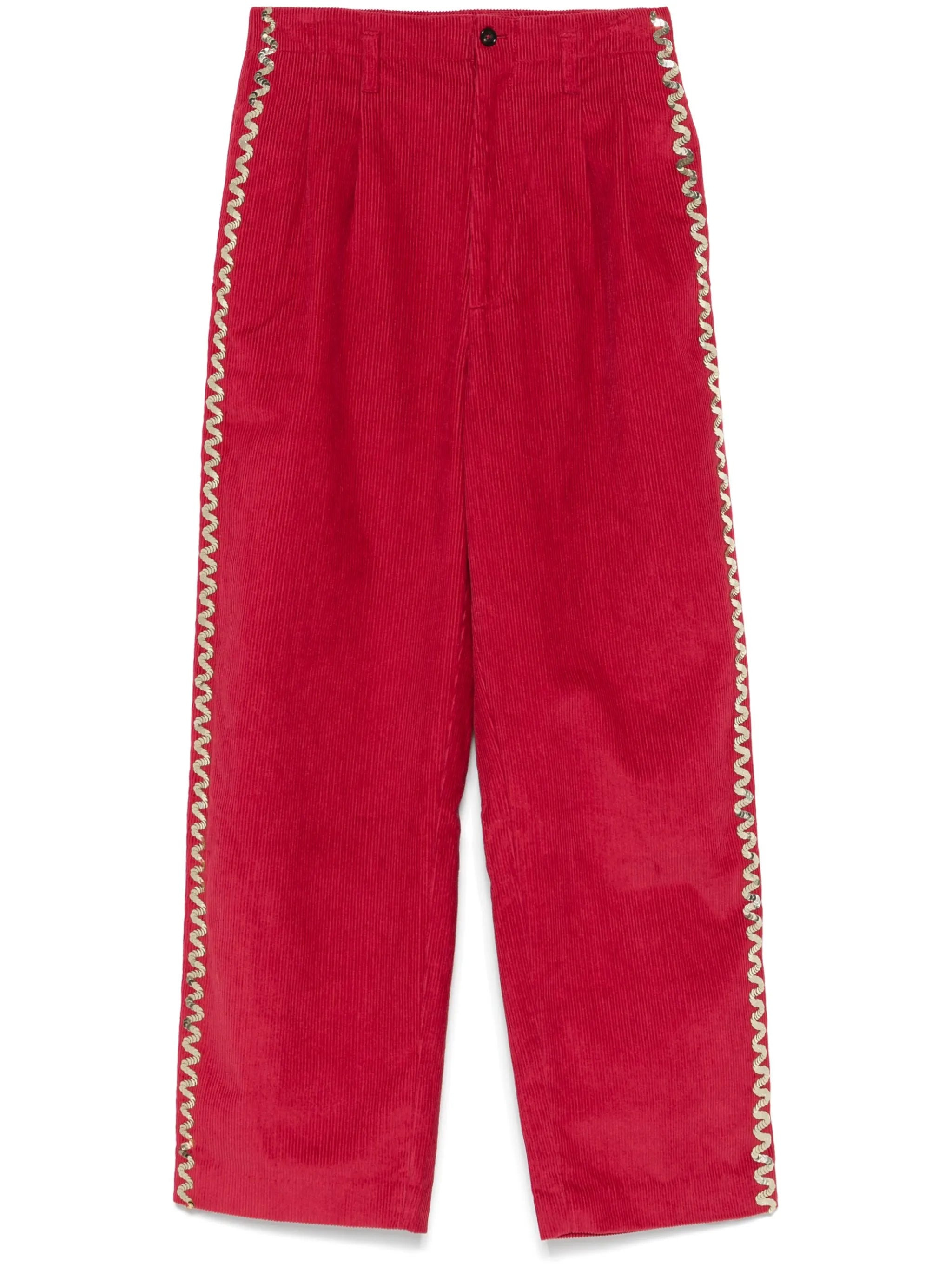 - medium red - cotton - corduroy - front button and zip fastening - belt loops - sequin embellishment to the side - pleat detailing - two side inset pockets - two rear button-fastening jetted pockets - high-waisted - wide leg Materials & Product Care Lining: viscose 100% Outer: Cotton 100% Size & Fit - Designed with a wide-leg cut, these trousers allow for a close fit at the waist and offer a loose and roomy fit over the leg - Made from a midweight non-stretch fabric - The elasticated waist allows for a comfortable fit - The model is 1.80 m wearing size 27.