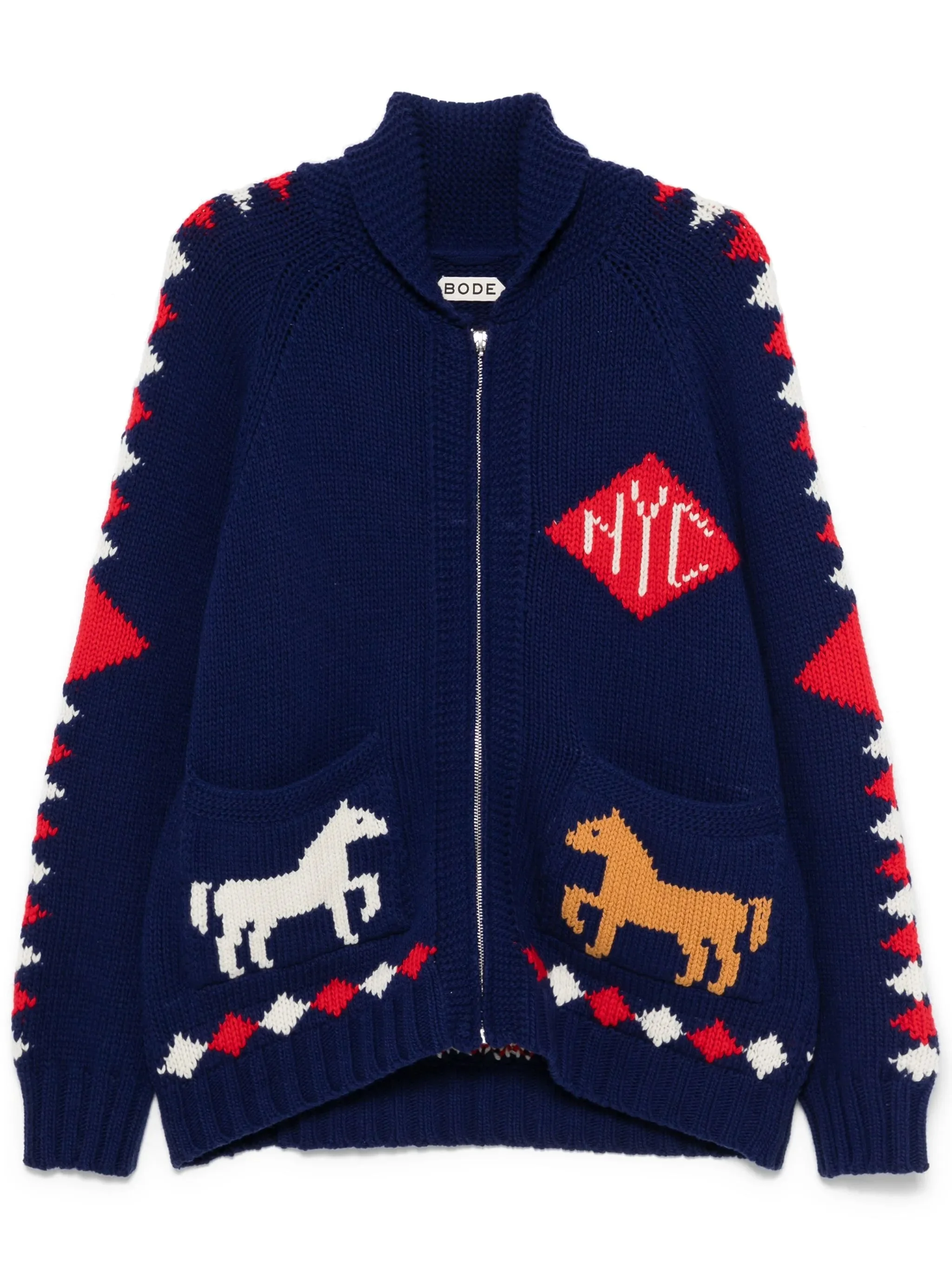 - royal blue - front zip fastening - long raglan sleeves - two side patch pockets - patterned intarsia knit Materials & Product Care Merino 100% Size & Fit - Designed for a relaxed fit, this piece allows for comfort and movement when worn - Made with a midweight knit, this piece offers some stretch - The model is 1.89 m wearing size M.