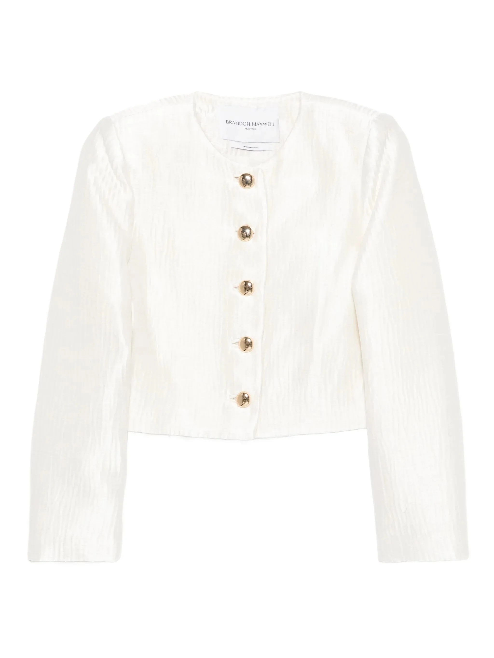 - pearl - textured silk - crew neck - single breasted - gold buttons - long sleeves Materials & Product Care Lining: Silk 93%, Spandex/Elastane 7% Outer: Silk 100% Size & Fit - The model is 1.77 m wearing size 2.