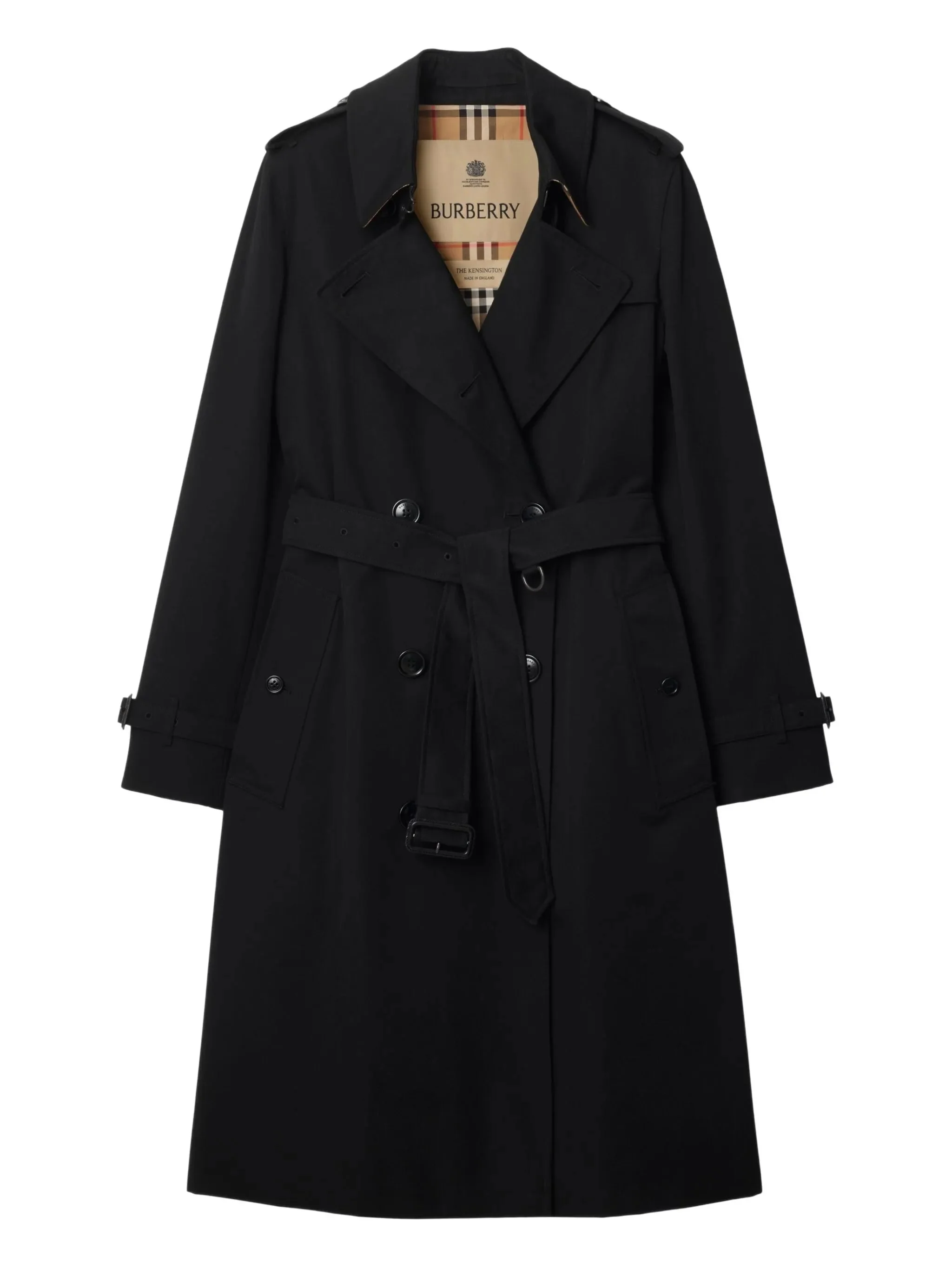 - black - shower-resistant gabardine - double-breasted button closure - hook-and-eye collar closure - throat latch - epaulettes - belted waist - two side button welt pockets - belted cuffs - back button vent Materials & Product Care Lining: Cotton 100% Outer: Cotton 100%