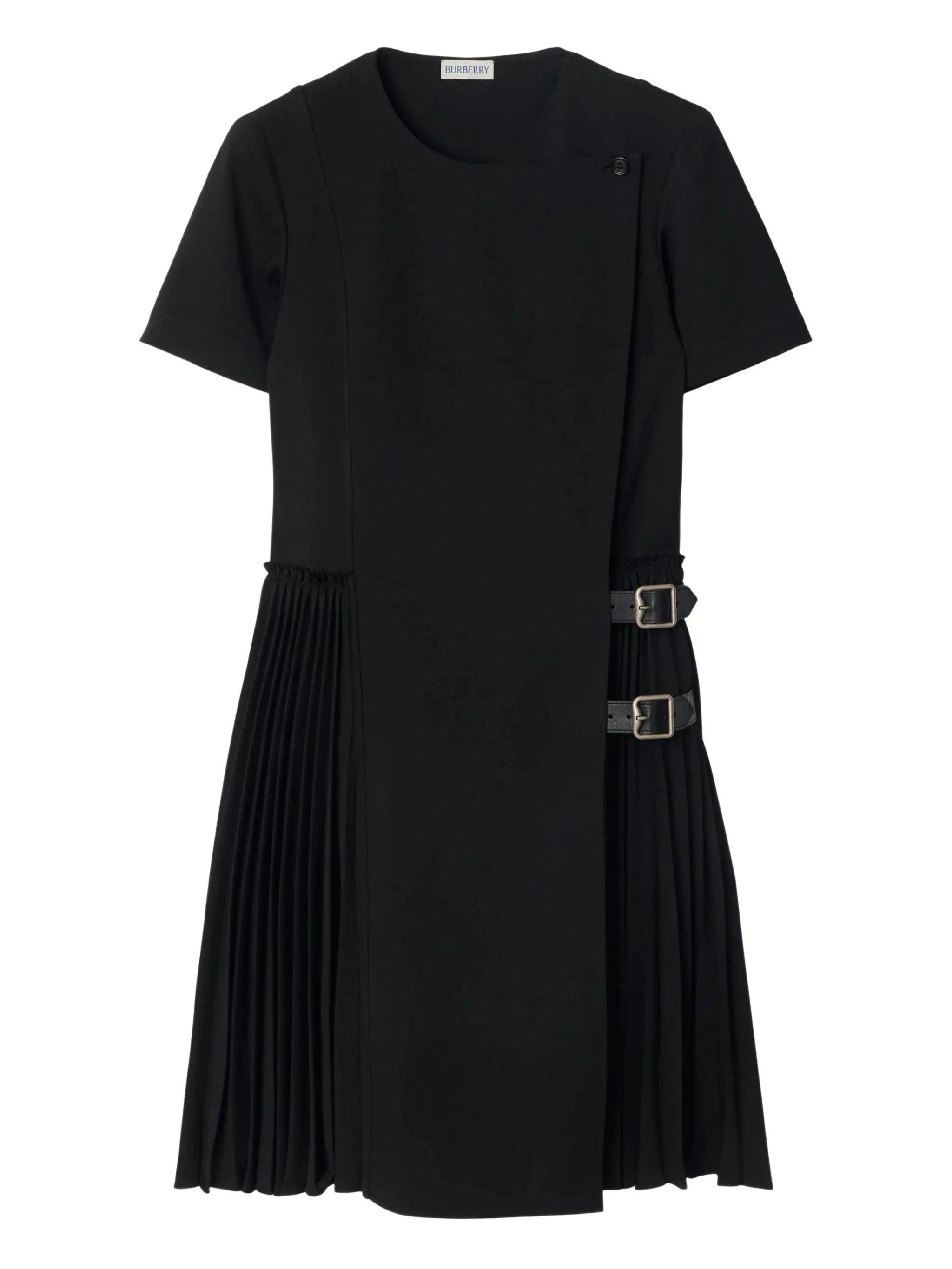- black - pleated skirt - wrap effect - short sleeves - leather buckles - button closure Materials & Product Care Calf Leather 100%, Polyester 55%, Wool 45%