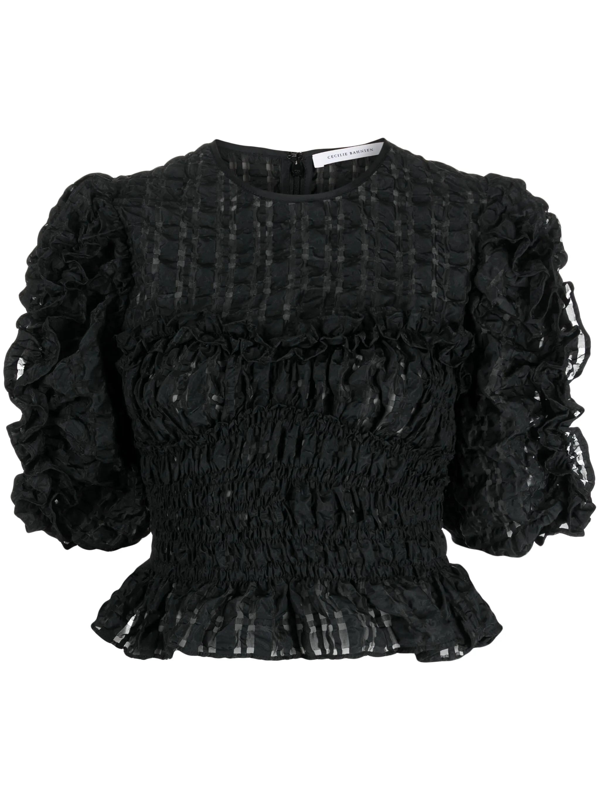 - black - smocking details - ruffled detailing - round neck - short puff sleeves - peplum hem Materials & Product Care Polyamide 15%, Polyester 85% Size & Fit - The model is 1.75 m wearing size 8.
