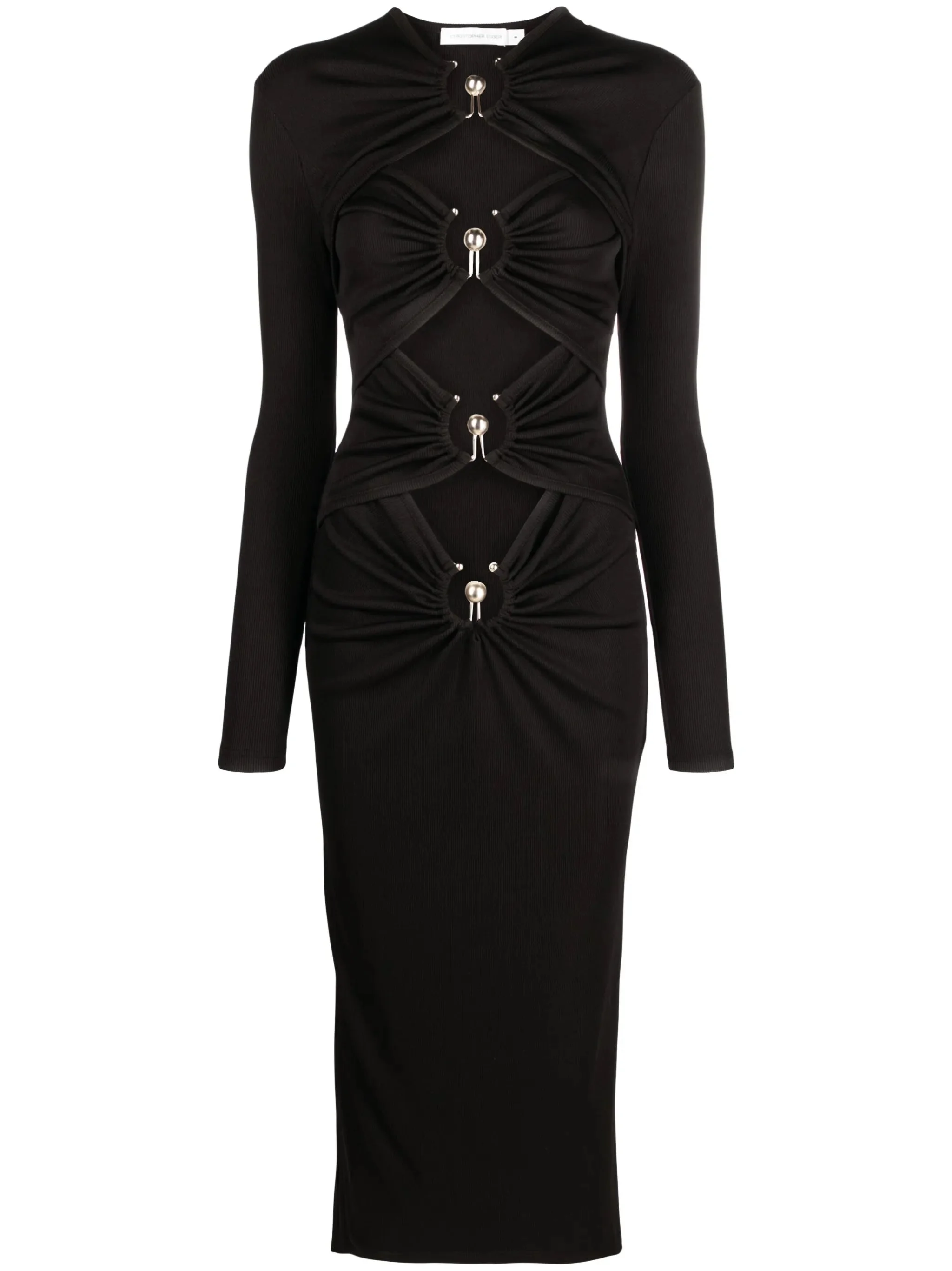 - black - stretch-jersey - silver-tone hardware - cut-out detailing - ruched detailing - V-neck - long sleeves - mid-calf length - straight hem Materials & Product Care Polyester 96%, Spandex/Elastane 4% Size & Fit - The model is 1.78 m wearing size 8.
