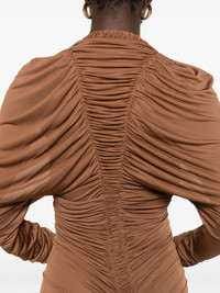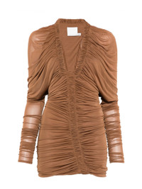 - russet - V-neck - long sleeve - ruched - mini length - form-fitting Materials & Product Care Polyester 29%, Rayon 71%