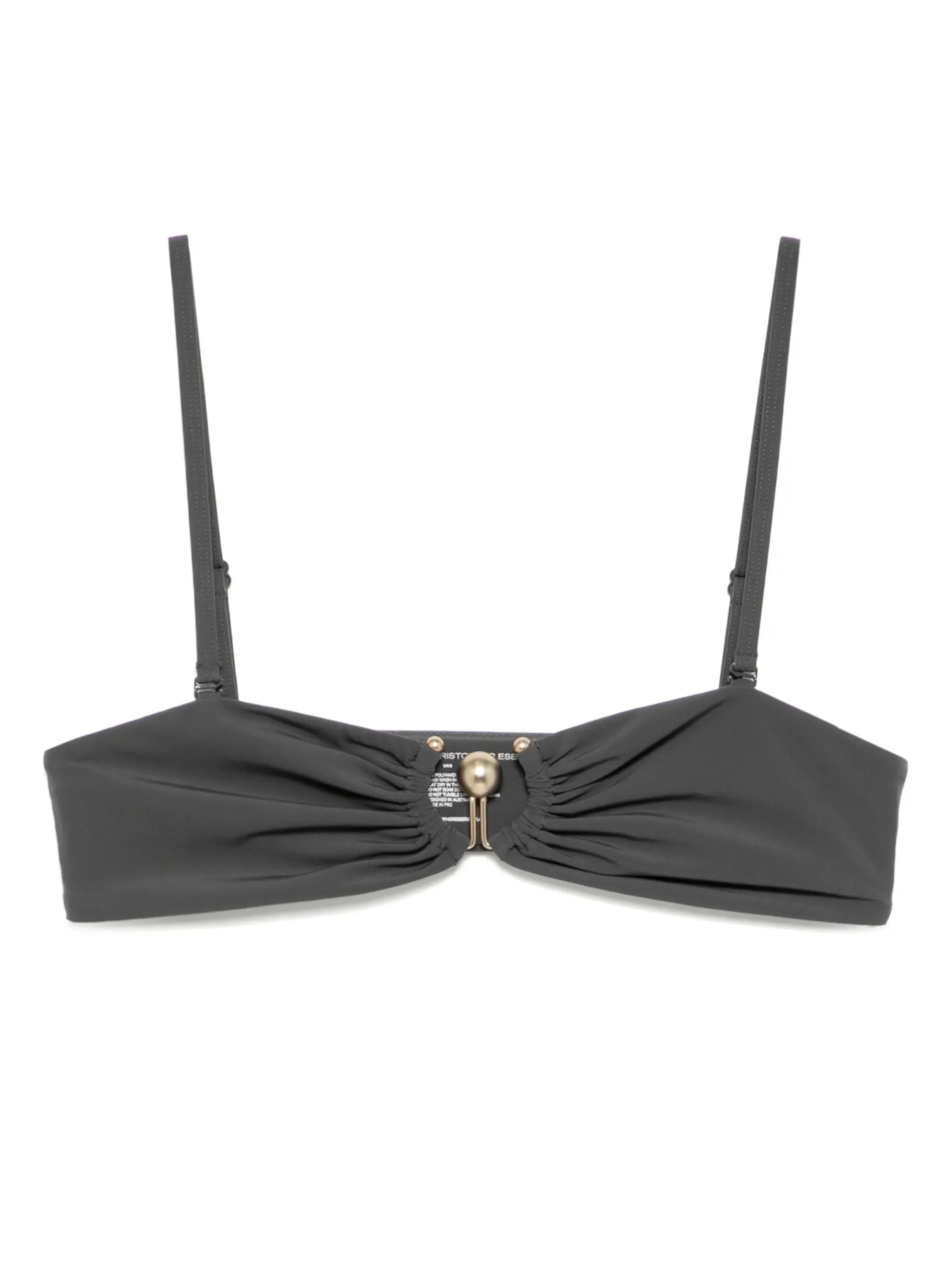 - charcoal grey - stretch-design - bandeau style - ruched detailing - no fastening - adjustable and detachable spaghetti straps - signature orbit hardware - full lining - Be mindful to try on swimwear over your own garments. Materials & Product Care Copper 100%, Polyamide 72%, Spandex/Elastane 28%