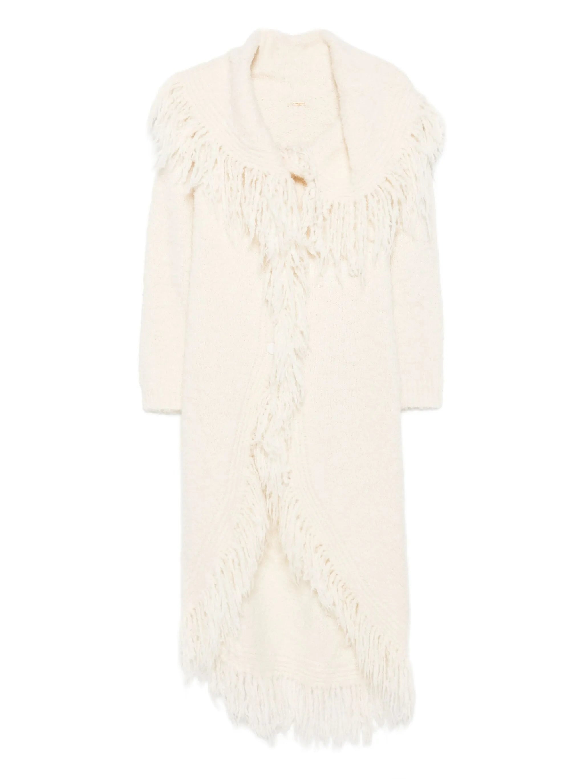 - cream - fringed collar - fringed hem - long sleeves - open front - textured knit Materials & Product Care Fabric 100% Size & Fit - The model is 1.75 m wearing size S.