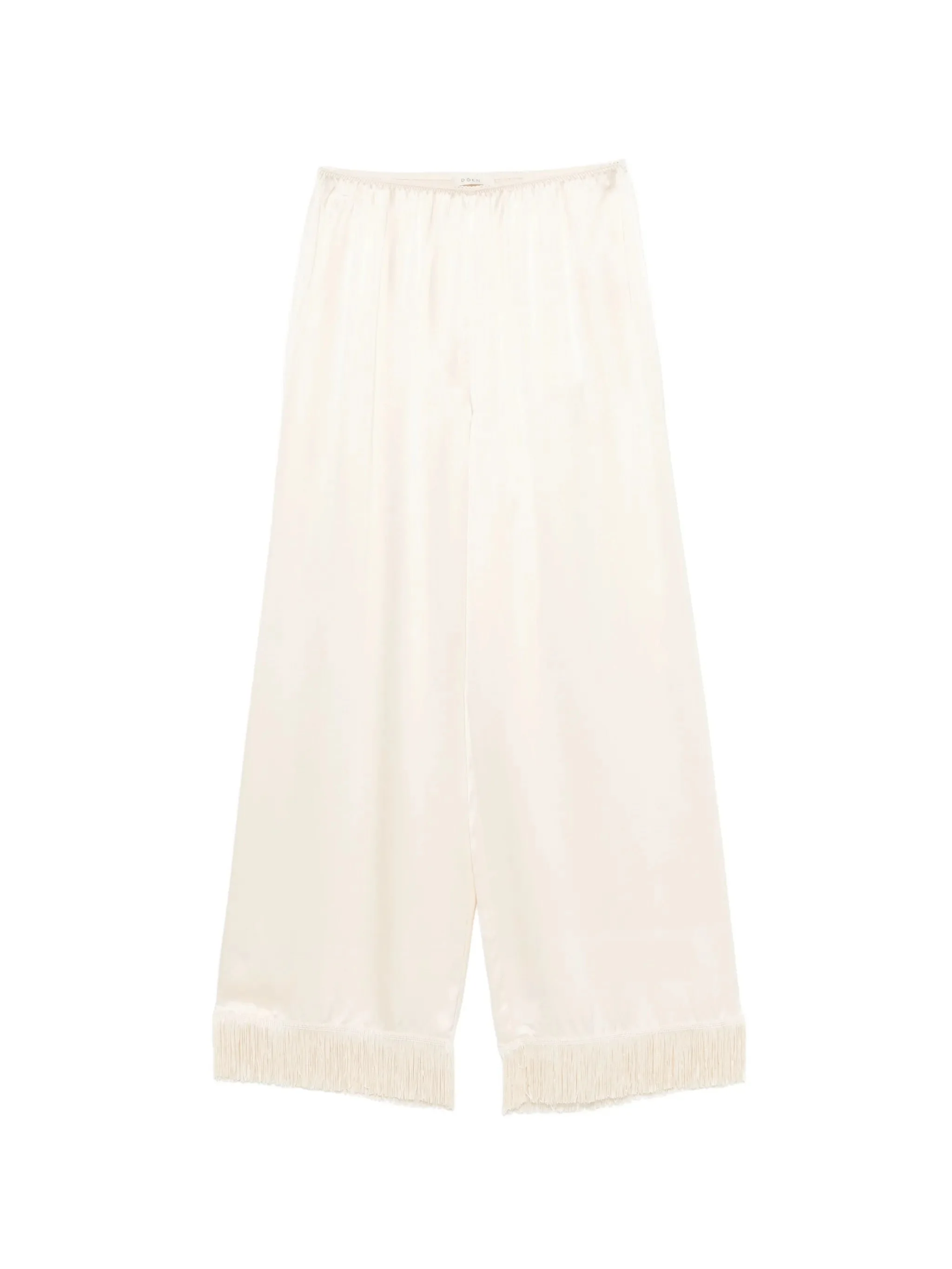 - beige - straight leg - fringe trim - elasticated waistband Materials & Product Care Silk 100% Size & Fit - The model is 1.78 m wearing size S.