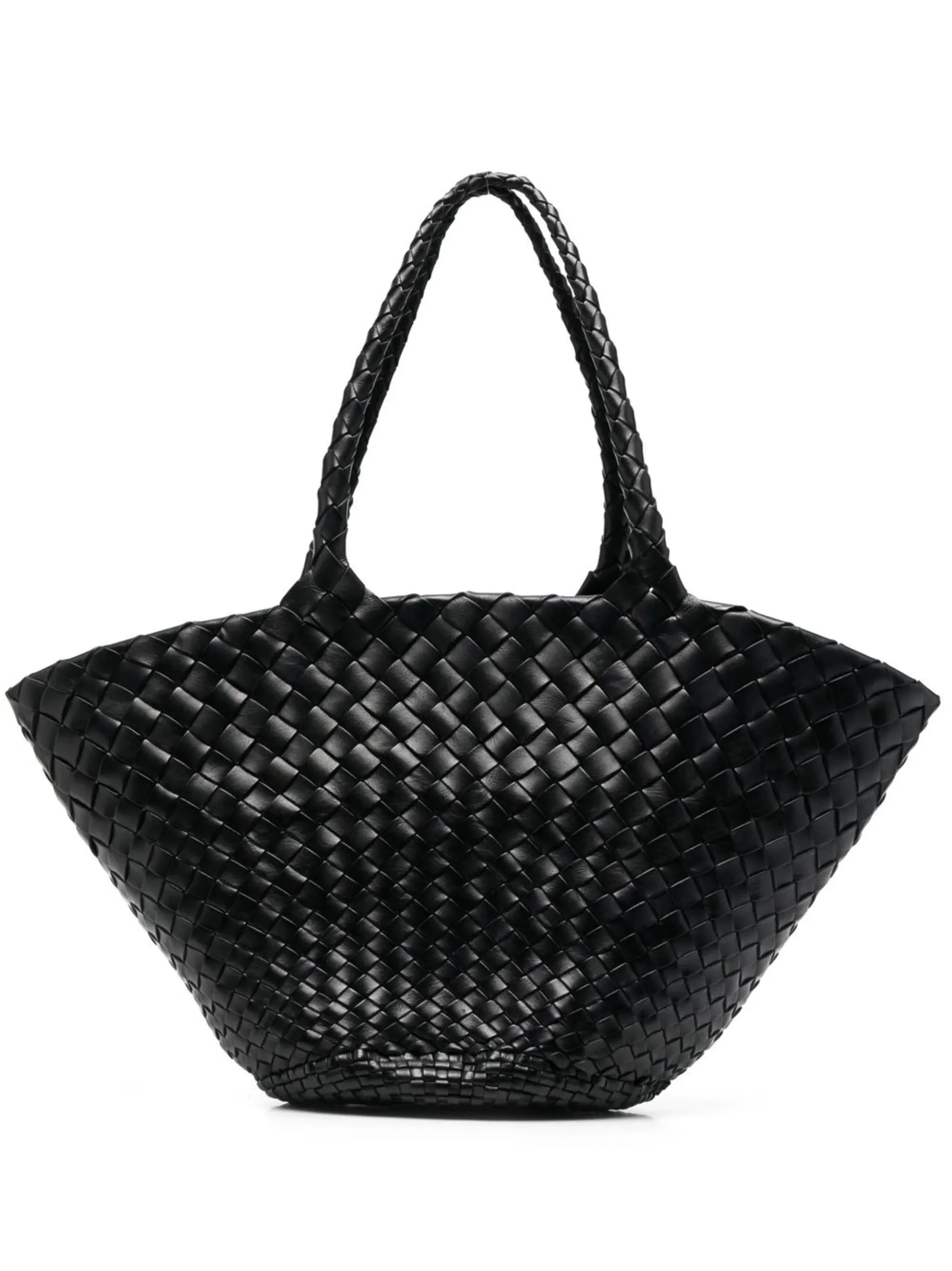 - jet black - leather - interwoven design - trapeze body - two rounded top handles - concealed press-stud fastening Materials & Product Care Outer: Leather 100% Size & Fit - The model is 1.76 m wearing size OS.