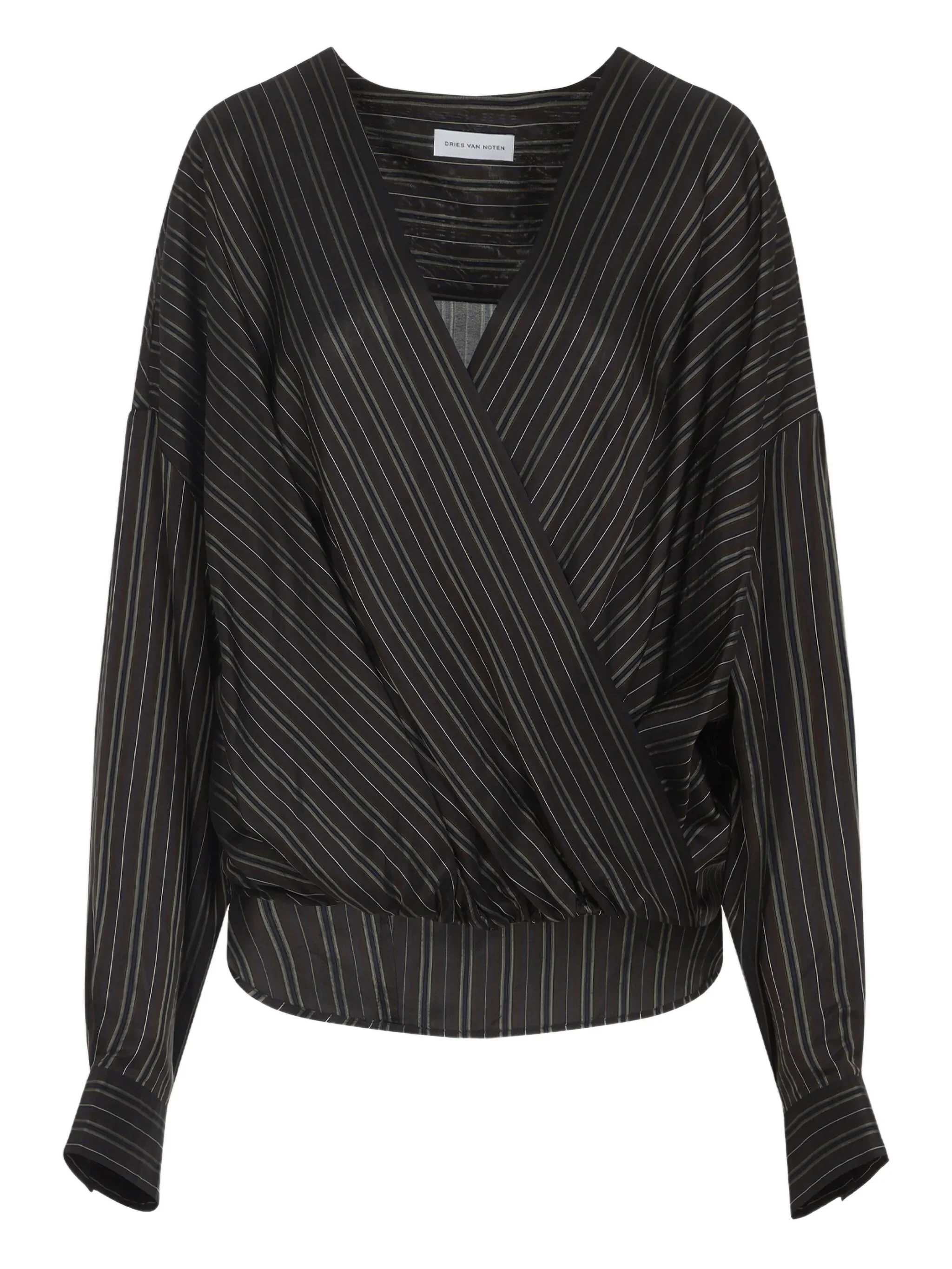 - brown - wrap front - striped pattern - long sleeves - V-neck - buttoned cuffs Materials & Product Care Cupro 100%