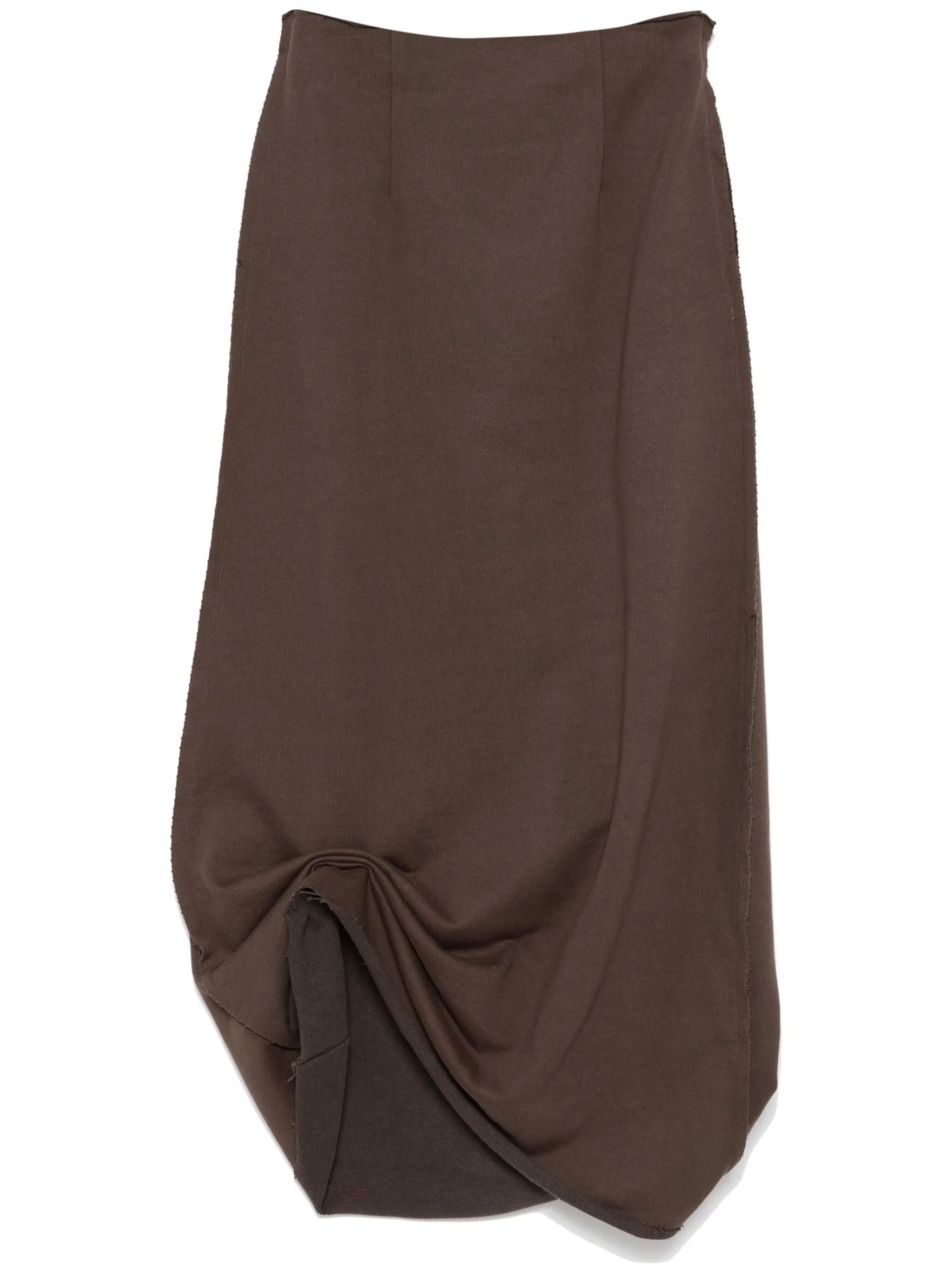 - cedar brown - cotton blend - jersey texture - concealed side zip fastening - gathered detailing at the hem - French terry lining - pencil silhouette - asymmetric hem - long length Materials & Product Care Cotton 97%, Spandex/Elastane 3% Size & Fit - Designed with an asymmetric hem, this skirt is intended to be worn just below the waist - Made from a midweight stretch fabric, this piece offers elasticity and flexibility when worn - The model is 1.80 m wearing size 2.