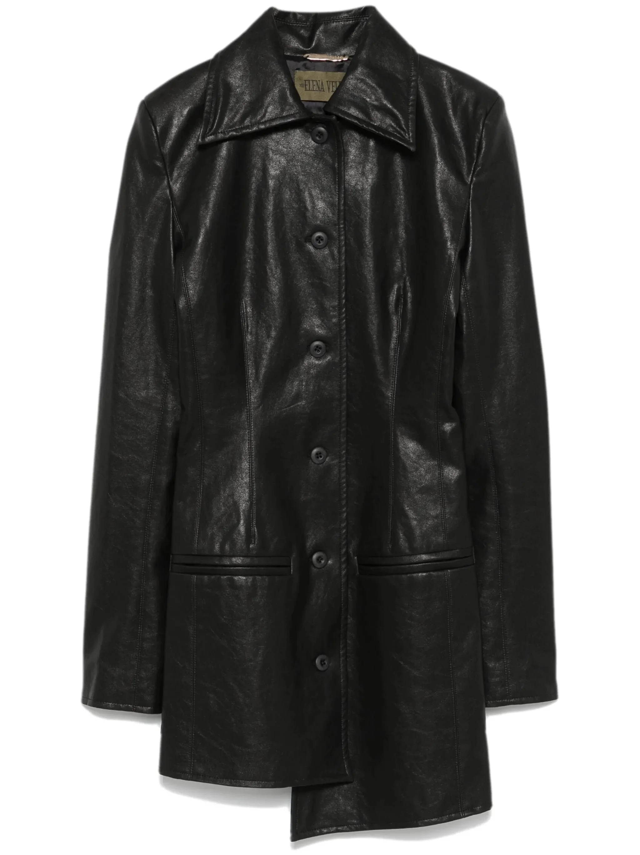 - black - faux leather - smooth grain - front button fastening - classic collar - shoulder pads - long sleeves - two front jetted pockets - full lining - asymmetric hem - thigh-length Materials & Product Care Rayon 100% Size & Fit - Designed for a slim fit that sits just away from the body offering a close yet comfortable fit - Made from a midweight non-stretch fabric - The internal shoulder pads offer a structured shape - The model is 1.75 m wearing size 2.