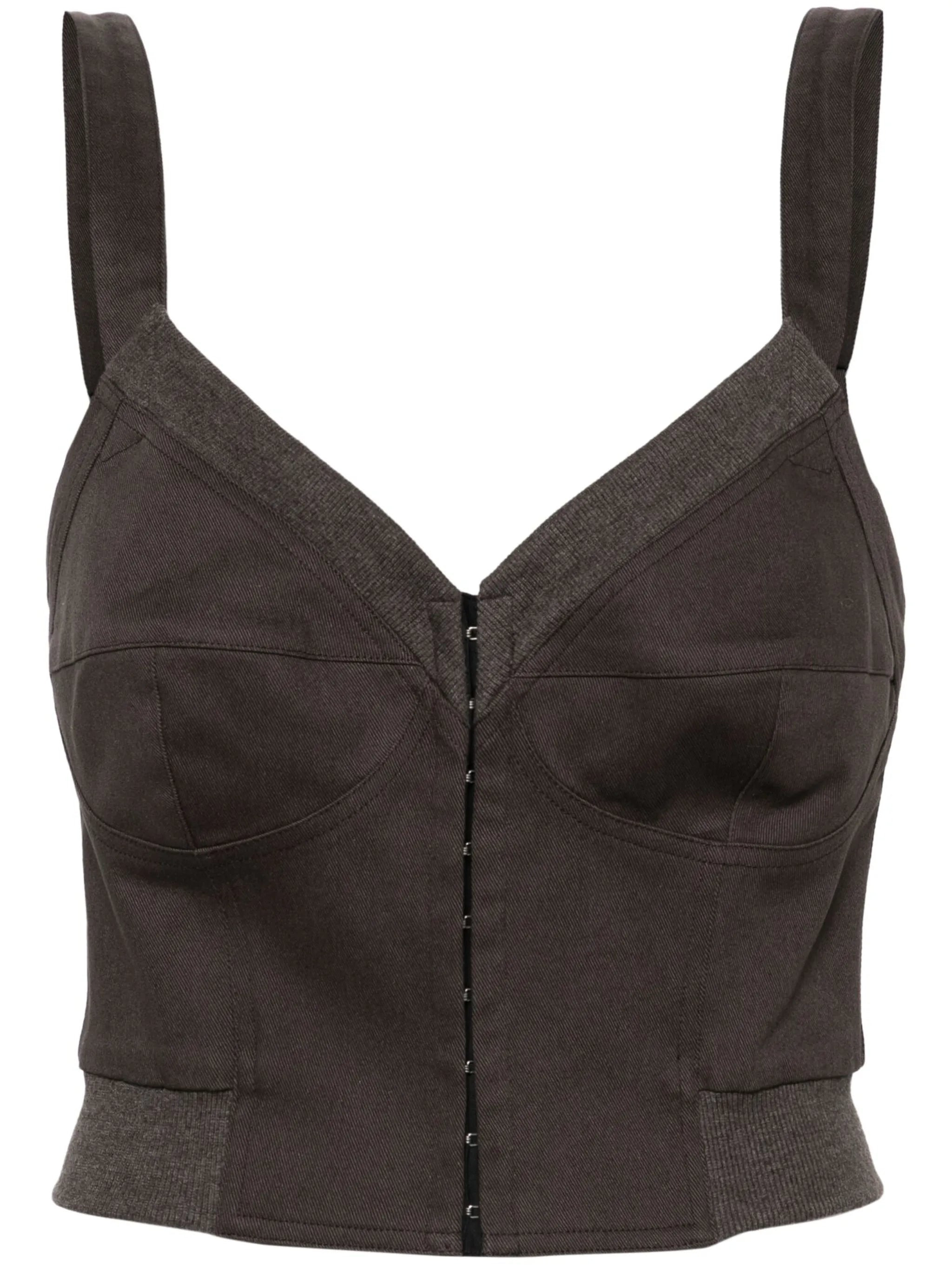 - coffee brown - cotton blend - gabardine weave - ribbed trim - bustier-style neckline - front hook and eye fastening - two adjustable shoulder straps - cropped ribbed hem Materials & Product Care Cotton 95%, Spandex/Elastane 5% Size & Fit - Designed for a slim fit that sits just away from the body offering a close yet comfortable fit - Made from a midweight stretch fabric, this piece offers elasticity and flexibility when worn - The adjustable shoulder straps allow for a preferred fit when worn - This piece fits true to size – take your usual size - The model is 1.77 m wearing size S.