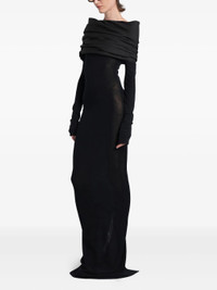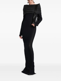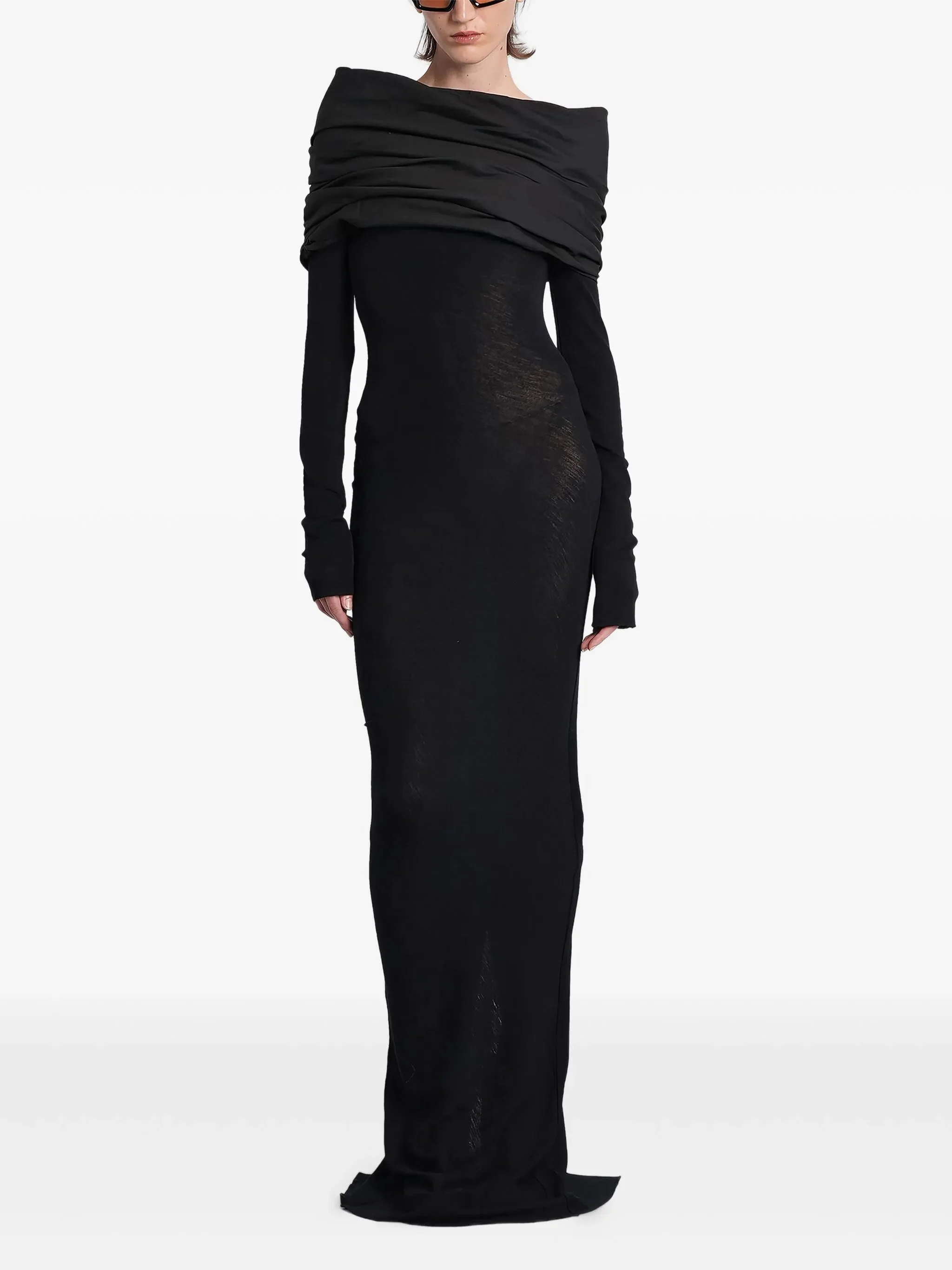 - black - draped neckline - long sleeves - thumbholes - fitted bodice - floor-length skirt Materials & Product Care Cotton 94%, Elastane 6%