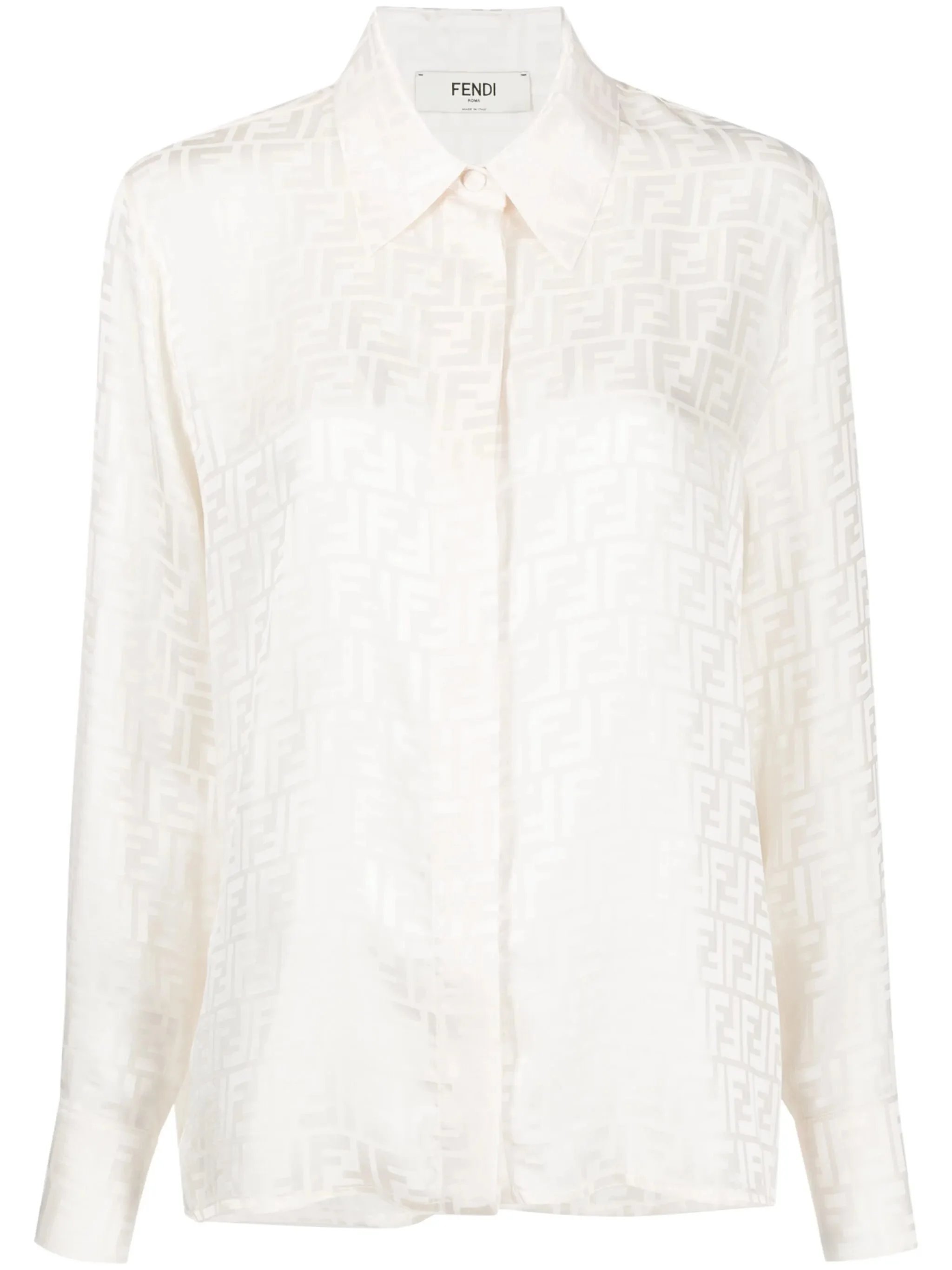 - cream white - silk - patterned jacquard - FF motif - pointed flat collar - drop shoulder - concealed front button fastening - long sleeves - curved hem Materials & Product Care Silk 100% Size & Fit - Designed to be unstructured, offering a loose fit throughout - Made from a lightweight non-stretch fabric - The model is 1.80 m wearing size 42.