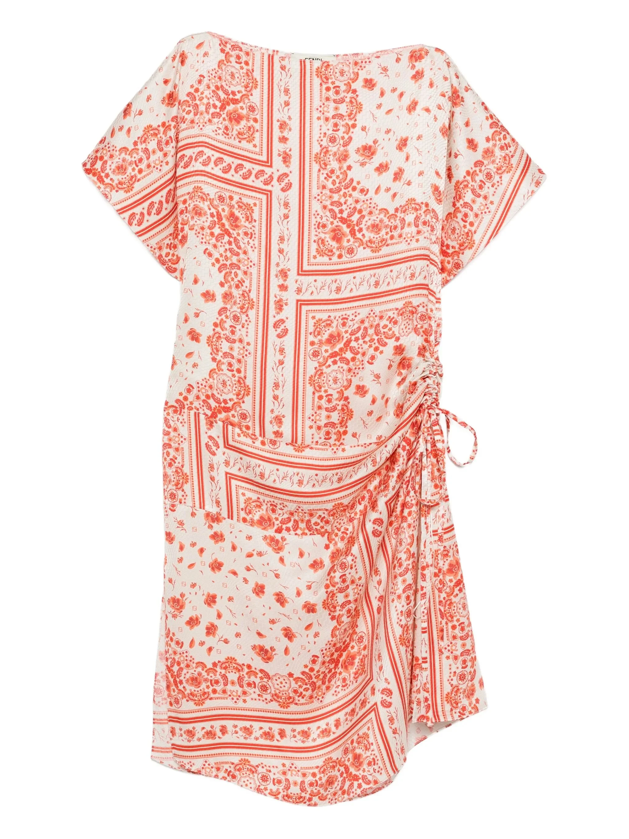 - beige - patterned jacquard - drawstring waist - short sleeves - boat neck - asymmetric hem Materials & Product Care Silk 100% Size & Fit - The model is 1.79 m wearing size 40.