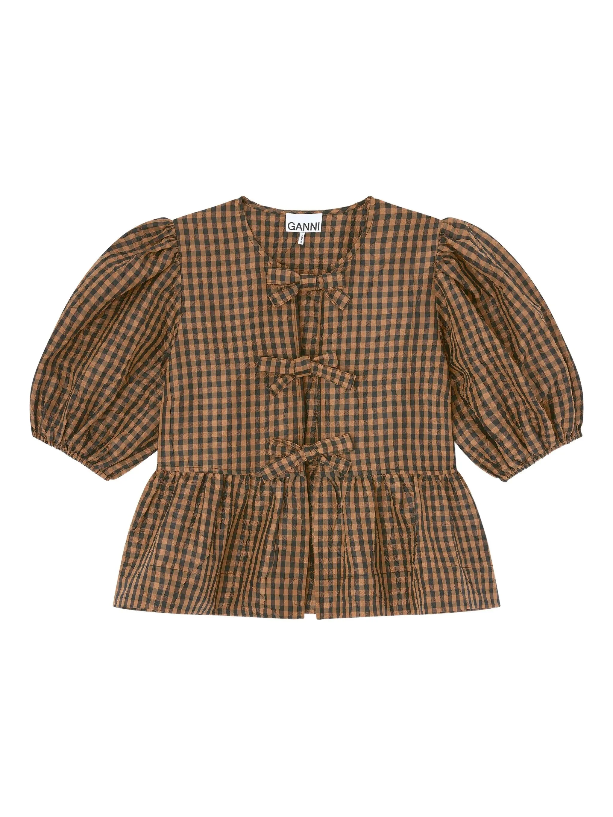 - brown - gingham pattern - bow detail - puff sleeves - peplum hem - round neck Materials & Product Care Fabric 100%