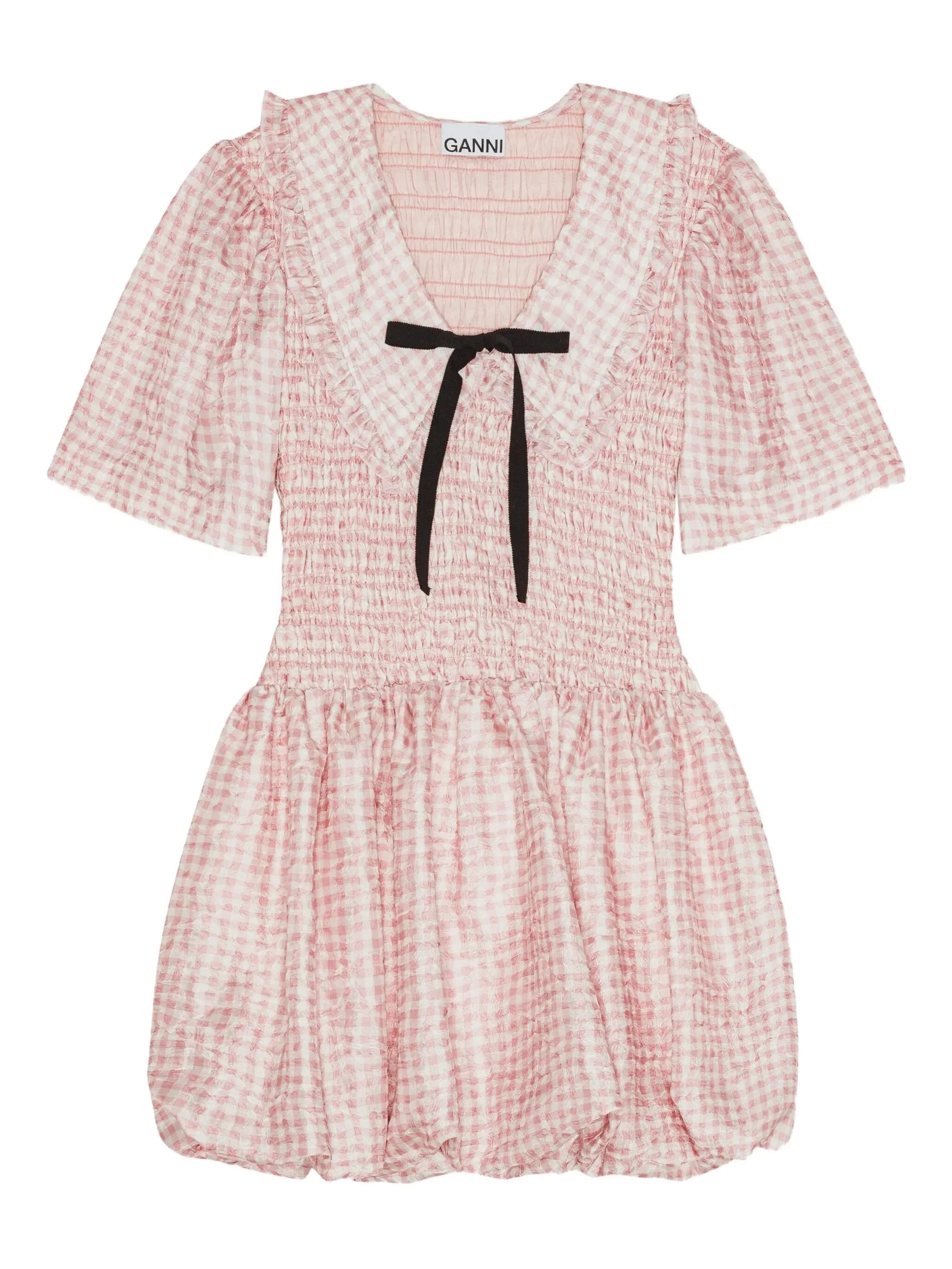 - pink check - ruffled collar - short puff sleeves - tie detail at neckline - gathered waistline Materials & Product Care Fabric 100%