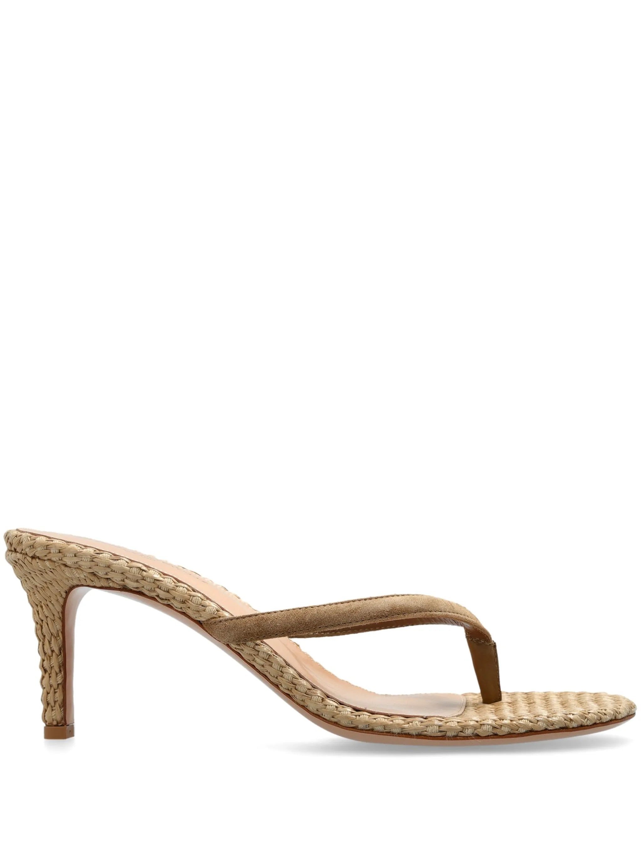 - sand beige - slip-on style - high stiletto heel - thong strap - branded footbed Materials & Product Care Lining: Calf Leather 100%, Raffia 100% Outer: Raffia 100% Sole: Calf Leather 100%