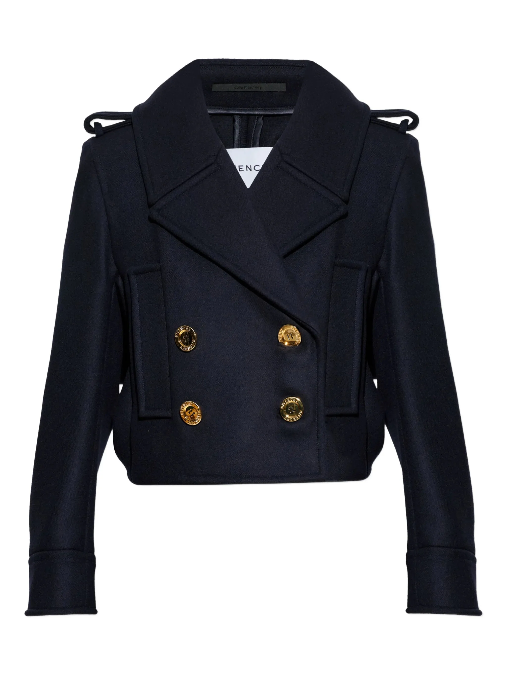 - navy blue - gold-tone buttons - shoulder epaulettes - peak lapels - double-breasted button fastening - cropped Materials & Product Care Wool 100%