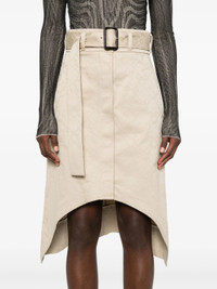- light beige - concealed front button fastening - detachable and adjustable waist belt - two front welt pockets - two rear flap pockets Materials & Product Care Lining: Polyester 45%, viscose 55% Outer: Cotton 100% Size & Fit - Designed with an asymmetric hem, this skirt is intended to be worn high on the waist - Made from a midweight non-stretch fabric - The belt offers adjustability for fitted preferences - The model is 1.77 m wearing size 36.