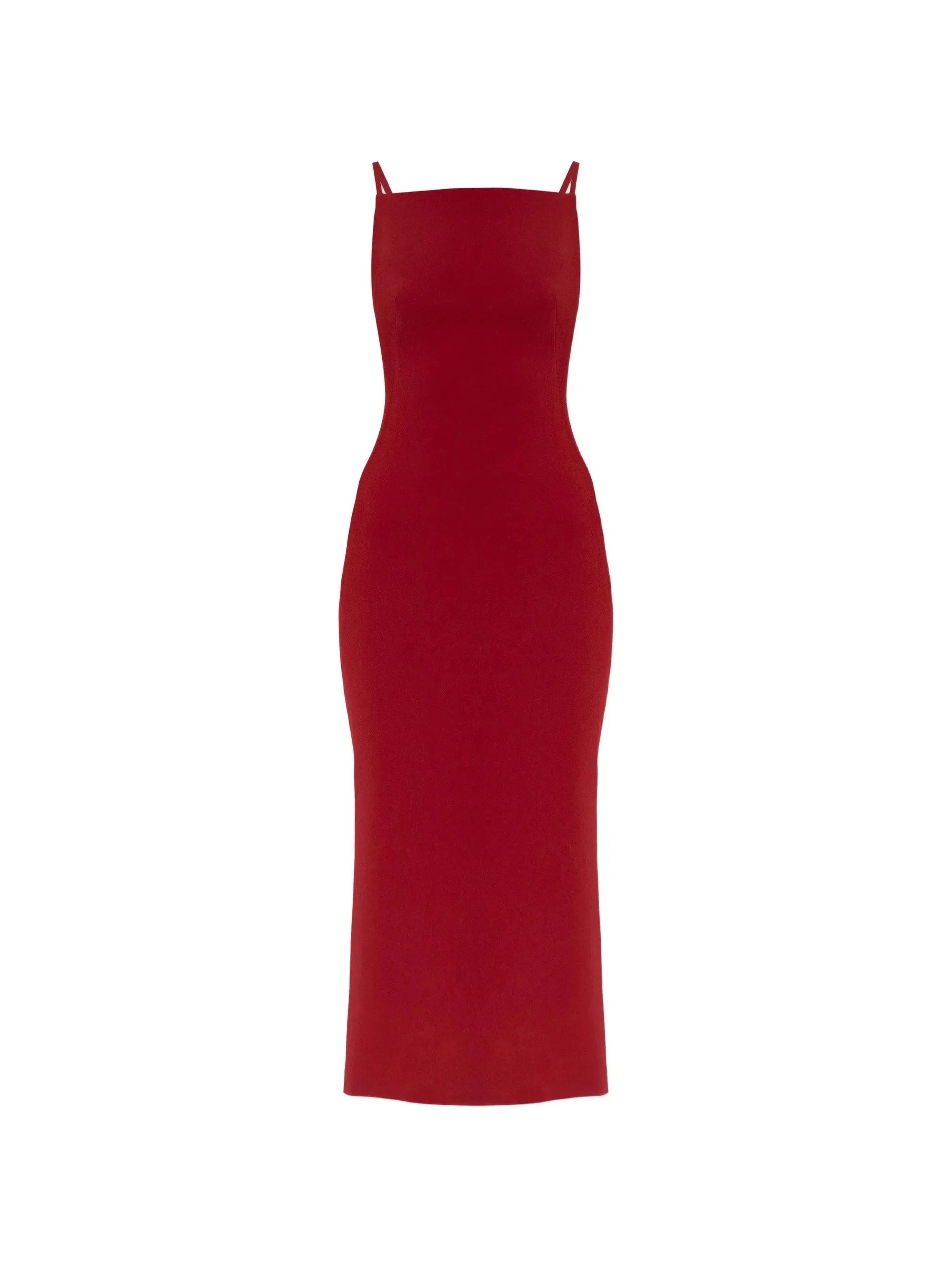 - dark red - slim fit - spaghetti straps - square neckline - concealed zip fastening - split hem Materials & Product Care Acetate 32%, Elastane 3% Outer: viscose 65%