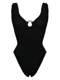 - black - stretch-design - shirred panel - one-piece design - thin straps - scoop neck - chest tortoiseshell ring detailing - scoop back - high cut - unlined - pull-on style - Be mindful to try on swimwear over your own garments. Materials & Product Care Elastane 3%, Polyamide 97%
