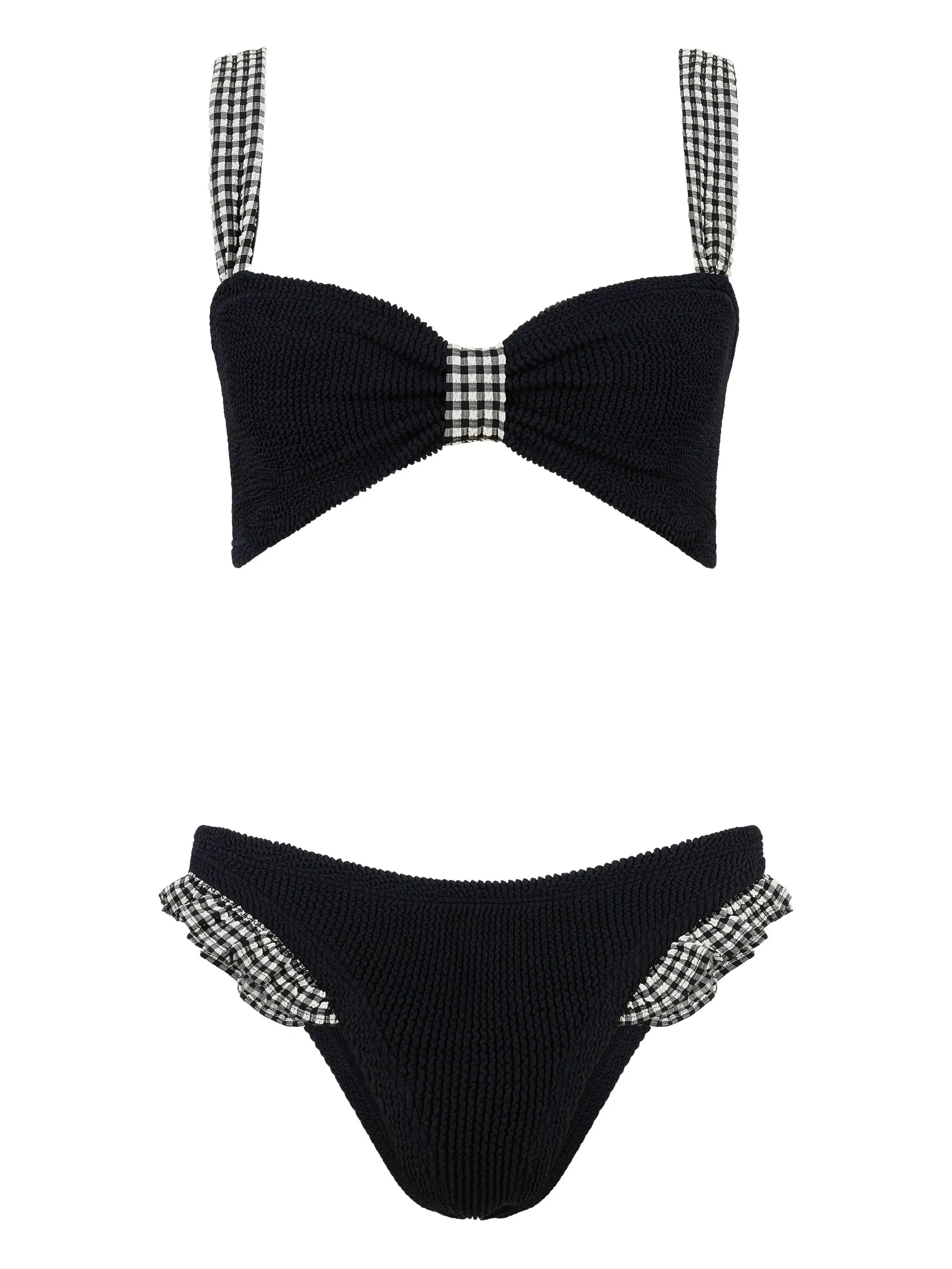 Loretta ruffled gingham-trimmed seersucker bikini Black