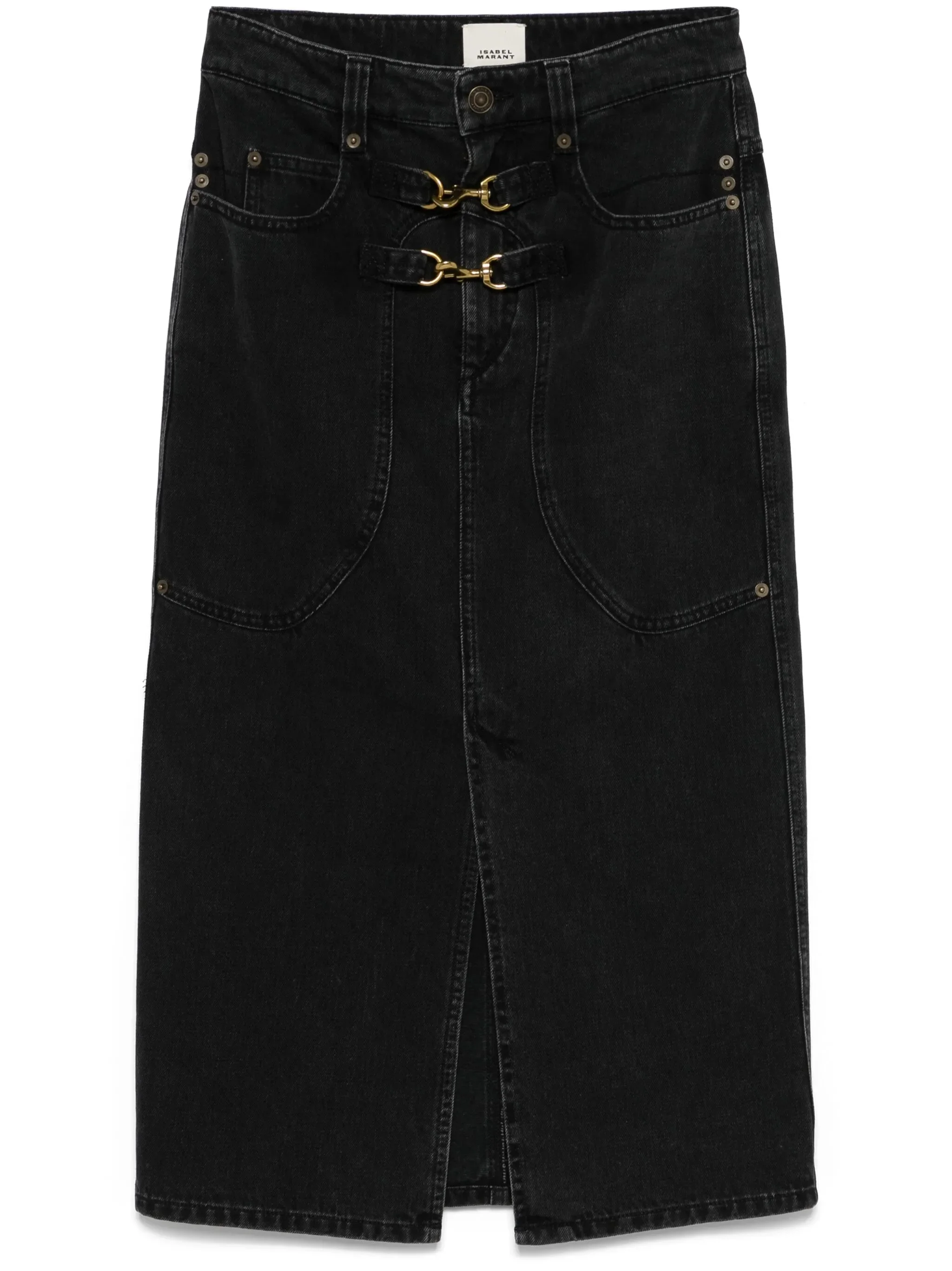 - black - concealed fly and button fastening - hook and eye fastening - classic five pockets - central rear vent Materials & Product Care Fabric 100% Size & Fit - This midi-length skirt is intended to be worn low on the hips - The model is 1.78 m wearing size 38.