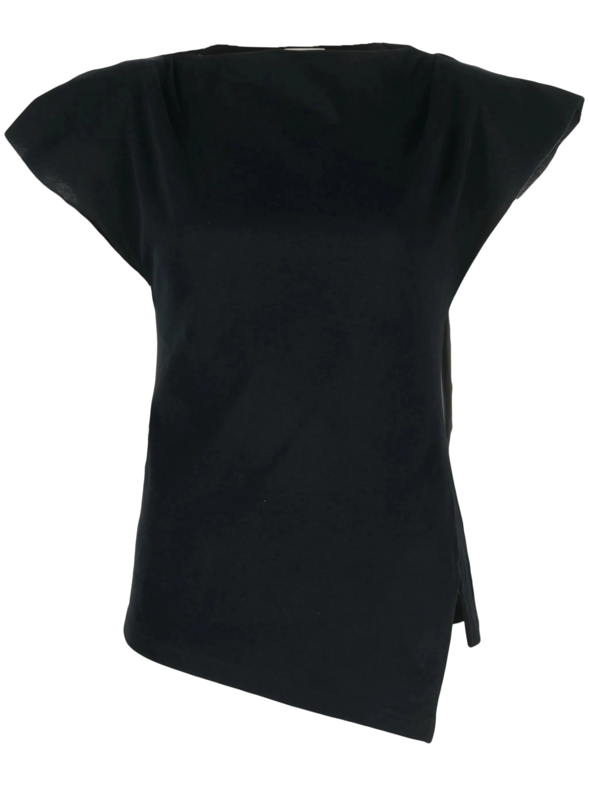 - jet black - organic cotton - boat neck - shoulder pads - cap sleeves - side slit - asymmetric hem Materials & Product Care Organic Cotton 100% Size & Fit - The model is 1.77 m wearing size S.